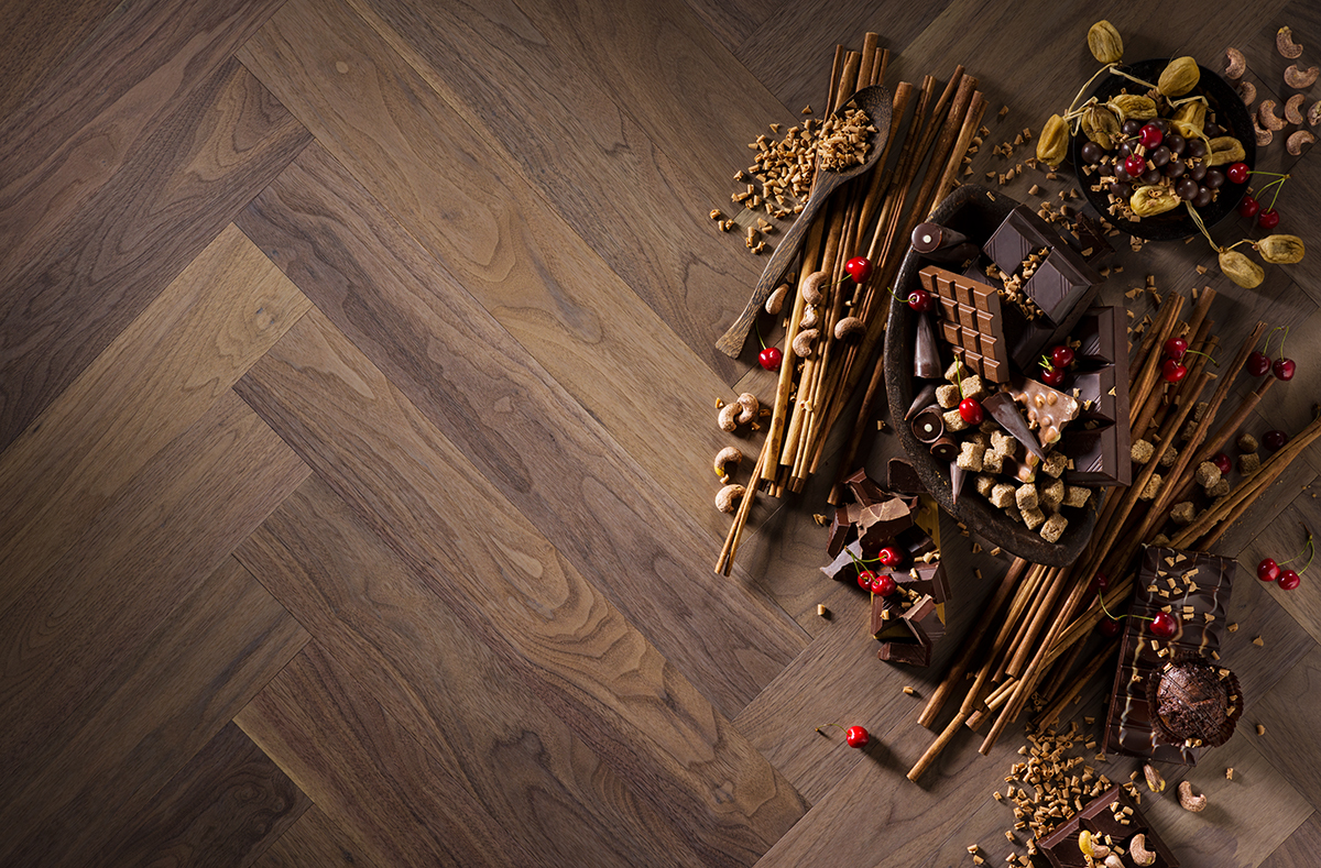 American Walnut flooring can be very different, brightly picturesque or soberly expressive, yet always a flashy accent of the interior design. Trendy smoky tones of Coswick’s Chevron and Herringbone products Sunset and Foggy Dawn blur the contrasting blends, retaining the tasteful chocolate hue and