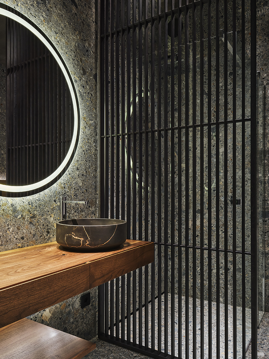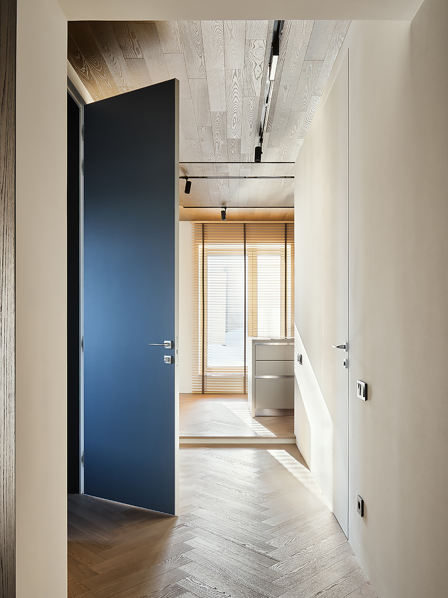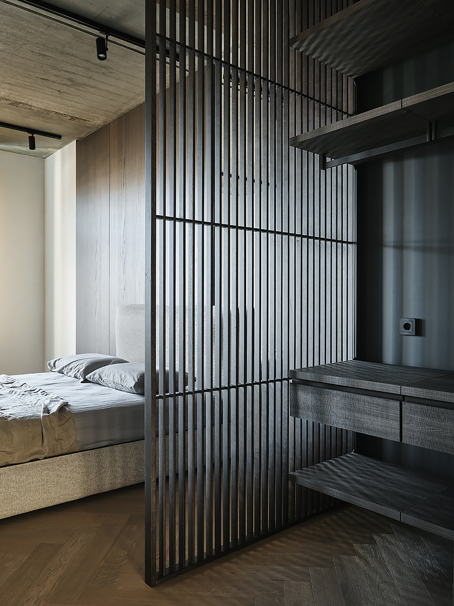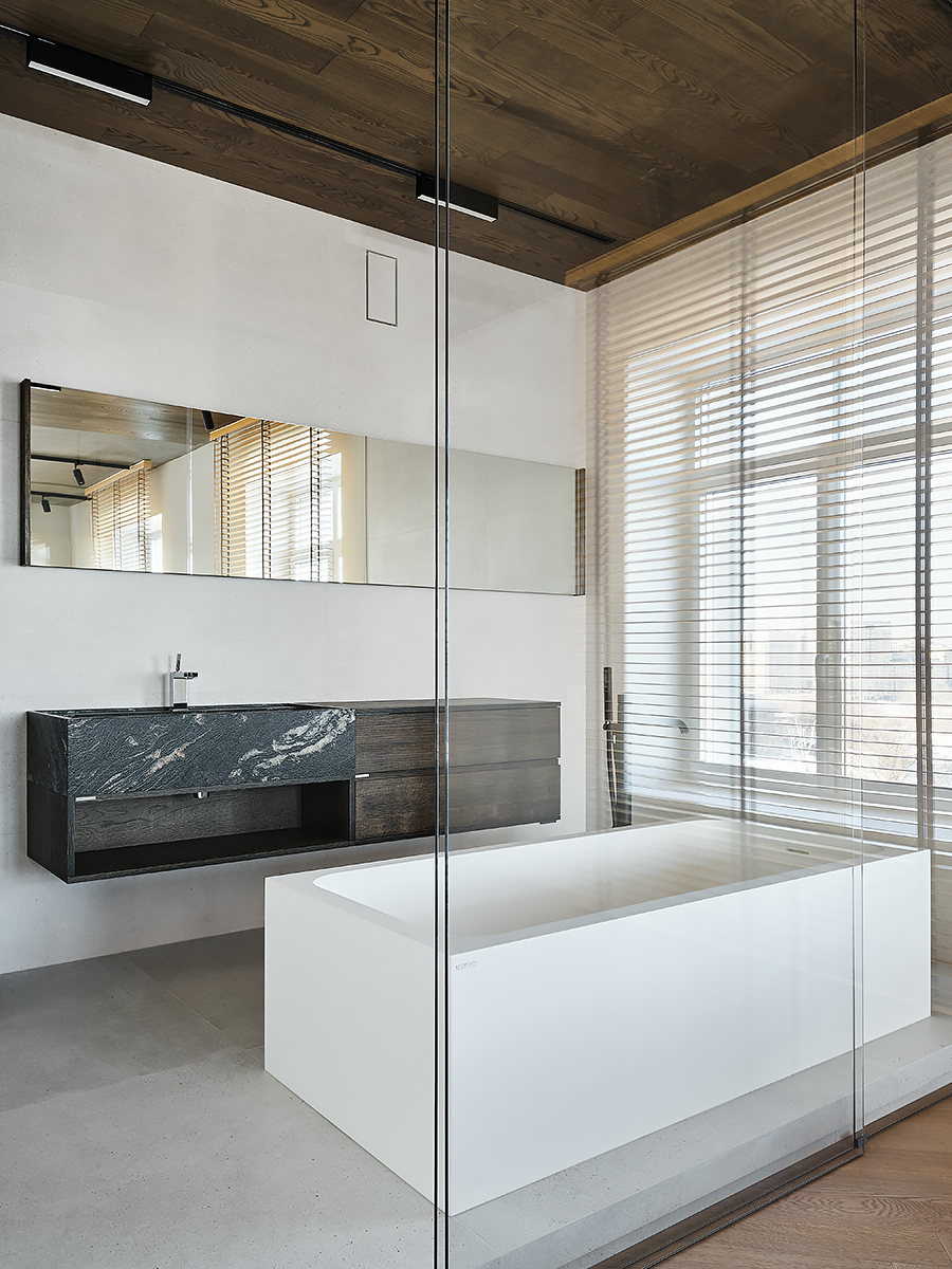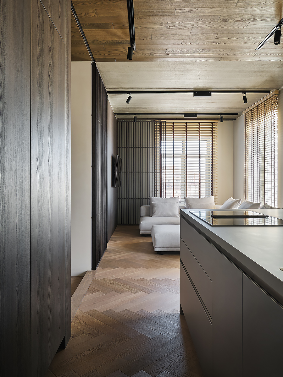 The designer managed to maximize the use of the room to reveal his character”, while maintaining the authenticity of the style. Wooden elements with clearly visible structure are used not only on the floor surface, but they are lined with walls and even ceiling. All this in combination with glass elements and metal creates a complete composition of the entire space of the apartment.