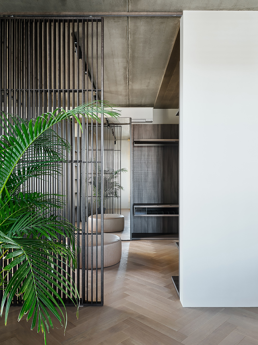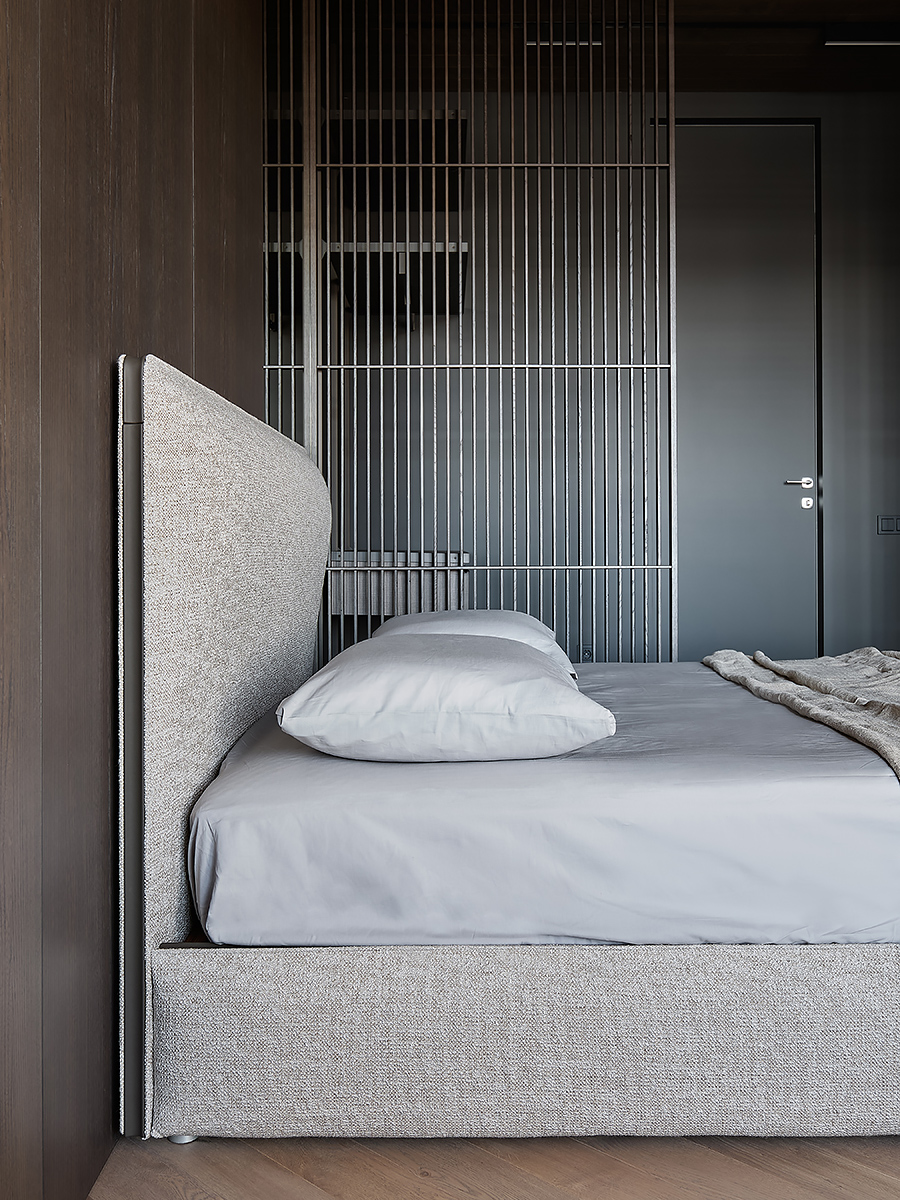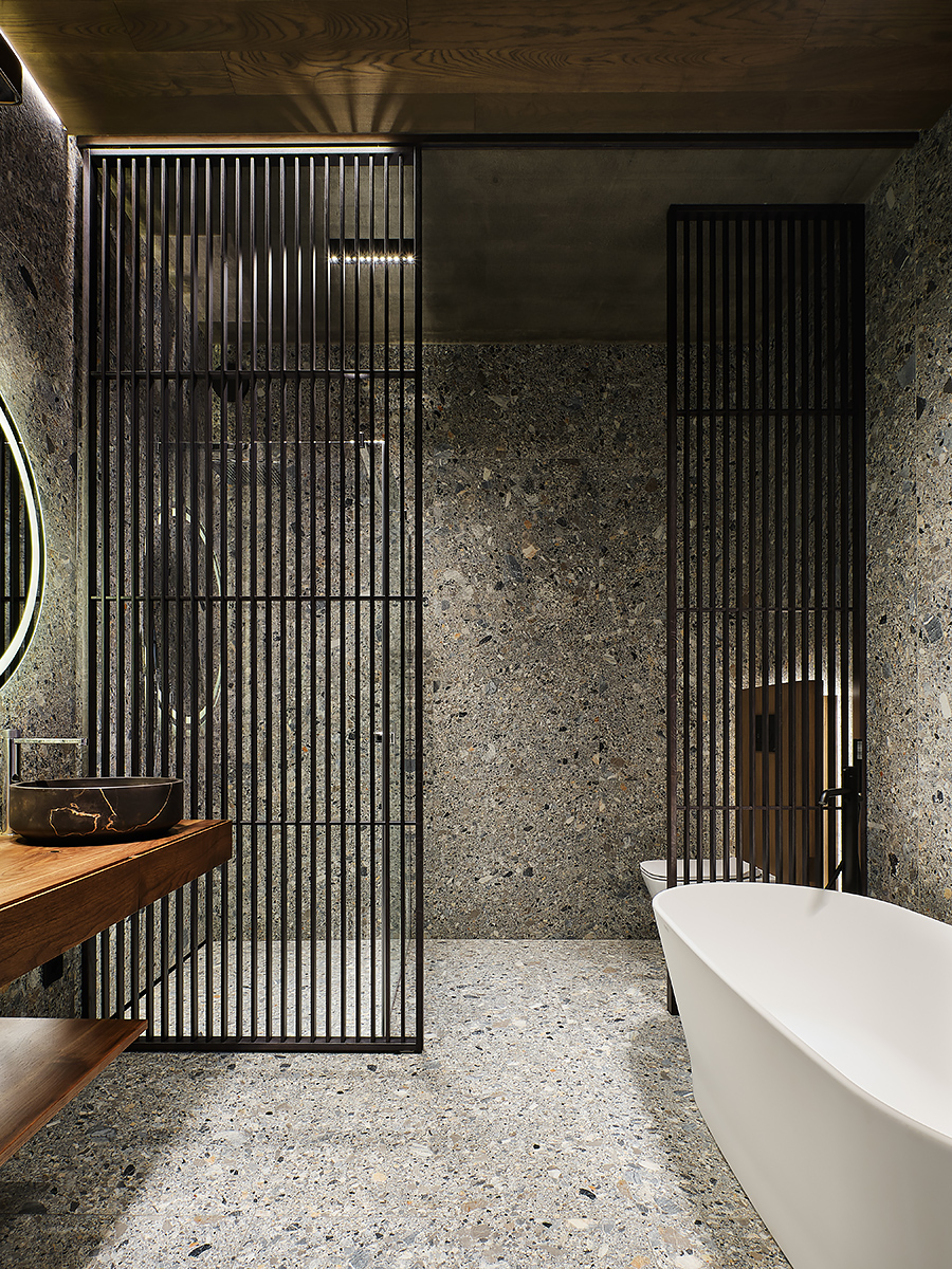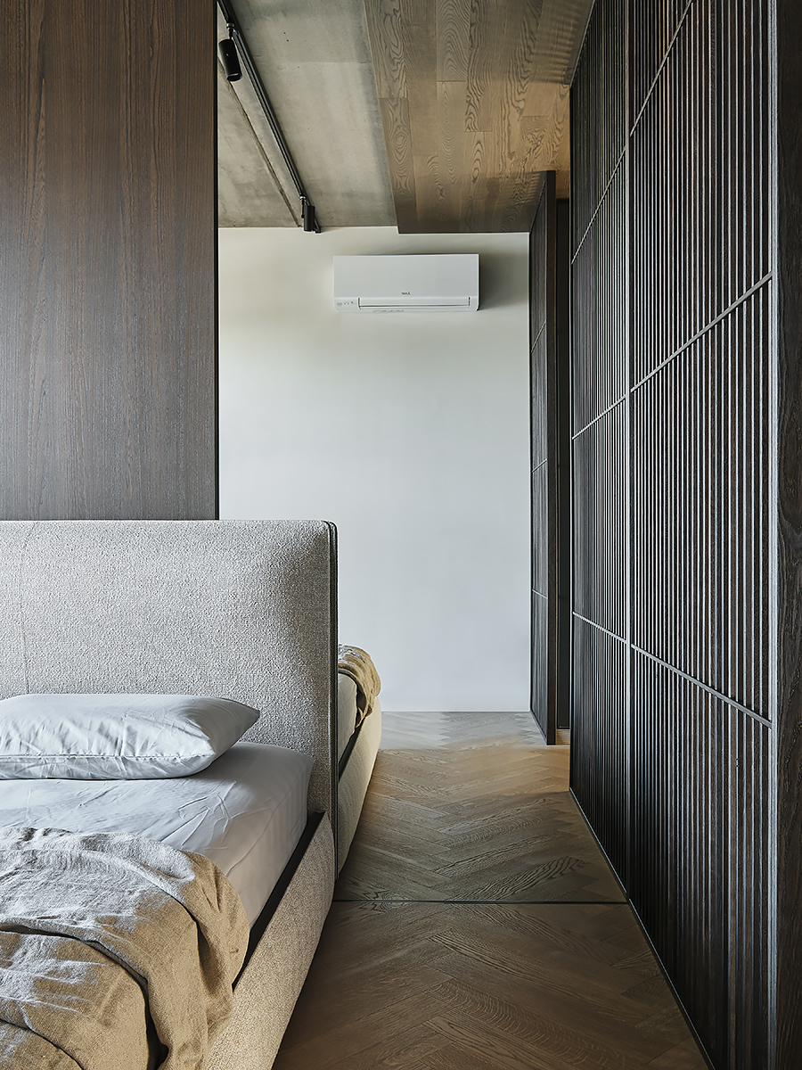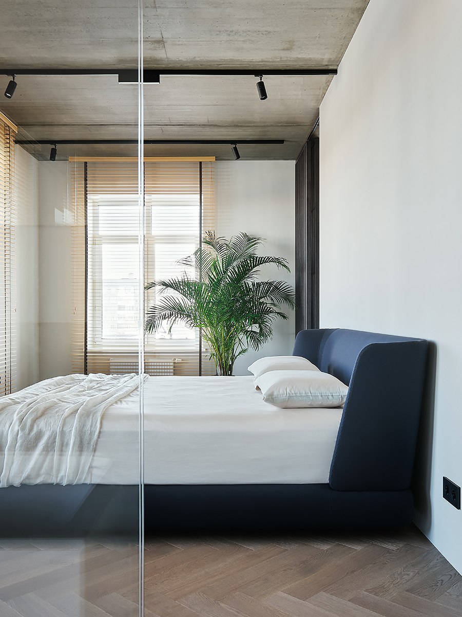 The designer managed to maximize the use of the room to reveal his character”, while maintaining the authenticity of the style. Wooden elements with clearly visible structure are used not only on the floor surface, but they are lined with walls and even ceiling. All this in combination with glass elements and metal creates a complete composition of the entire space of the apartment.