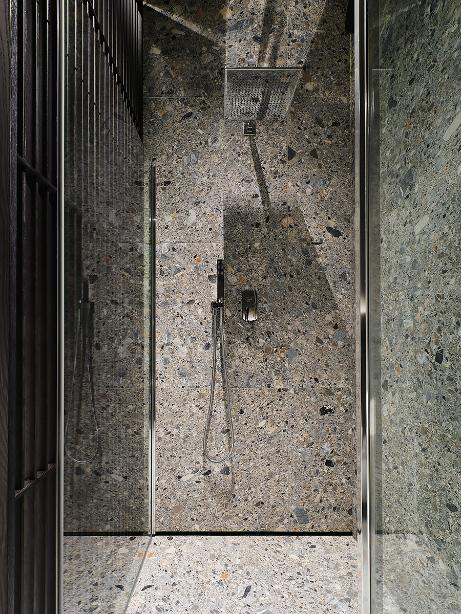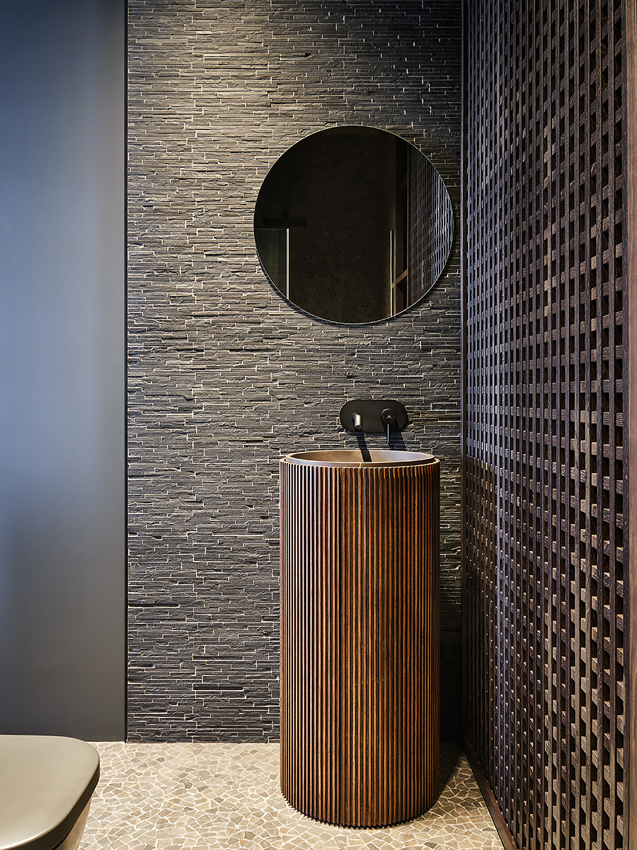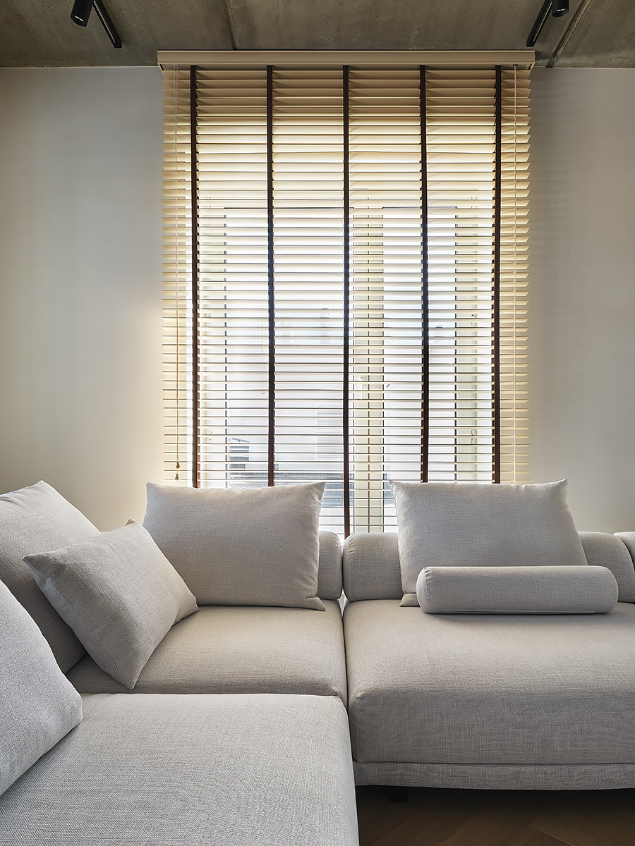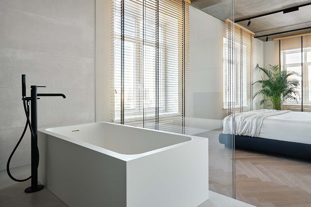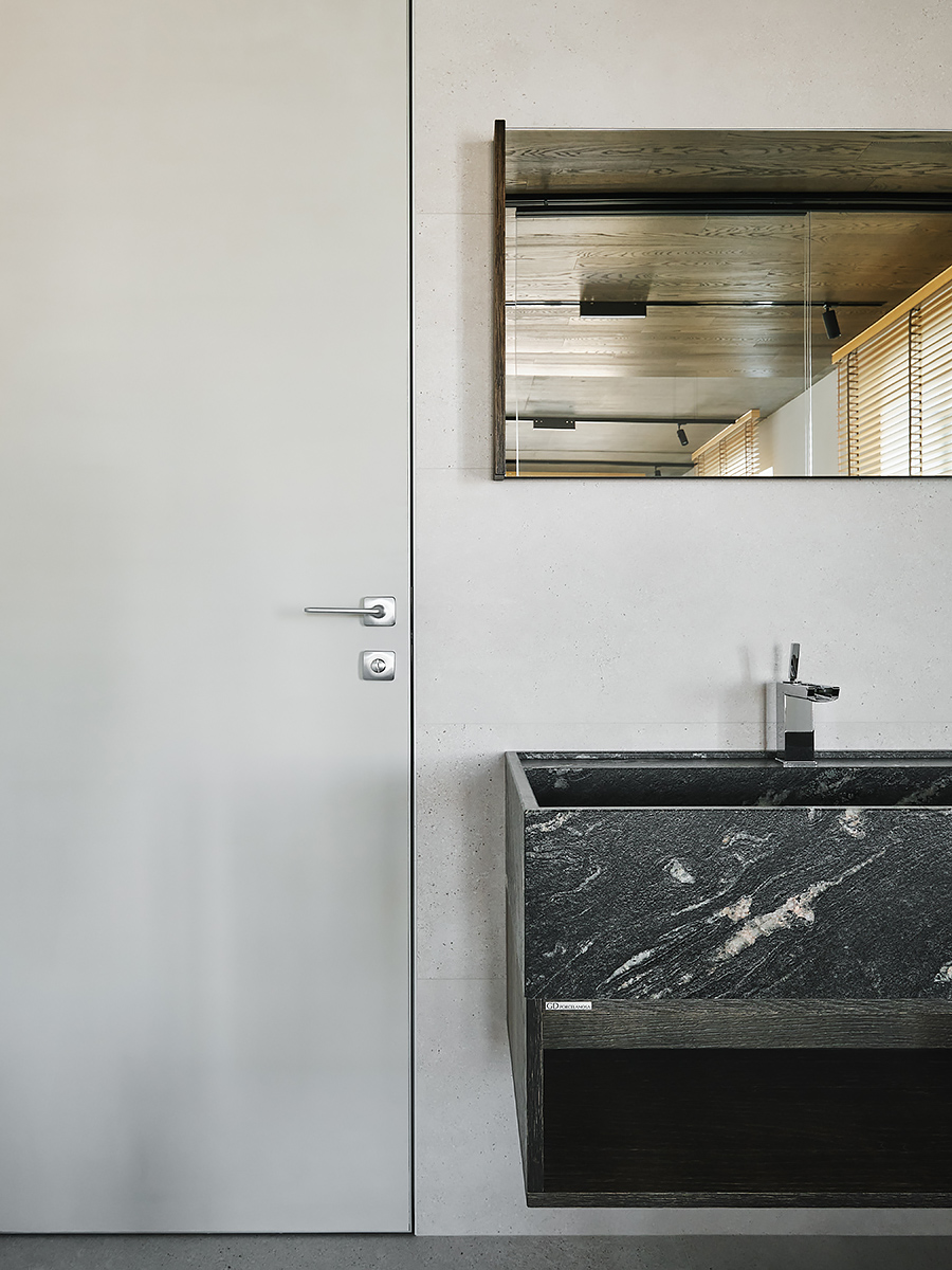The designer managed to maximize the use of the room to reveal his character”, while maintaining the authenticity of the style. Wooden elements with clearly visible structure are used not only on the floor surface, but they are lined with walls and even ceiling. All this in combination with glass elements and metal creates a complete composition of the entire space of the apartment.