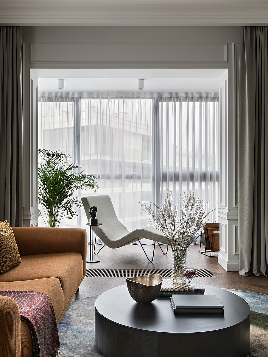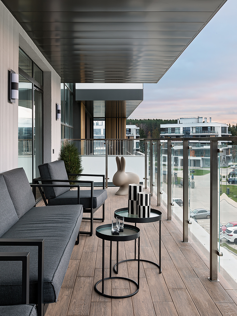 Thanks to the free layout it was possible to create a big open space with panoramic windows that connects the entrance, kitchen, living room and relax zone. It also allowed for enough space for a separate bedroom and a balcony where one could easily organise a working space with a majestic view form a massive window. This solution allowed to retain the feeling of freedom and air while also creating a cozy and functional private zone.