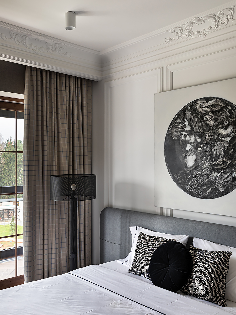 To note, the bedroom door was made into a stunning, perhaps even extravagant accent, as it was decorated in an English style loved by the customer. Stylistically it’s supported by mouldings and stuccos as well as Herringbone flooring. Hardwood flooring was essential for the customer as only real wood can give the feeling of naturalness, texture and warmth.