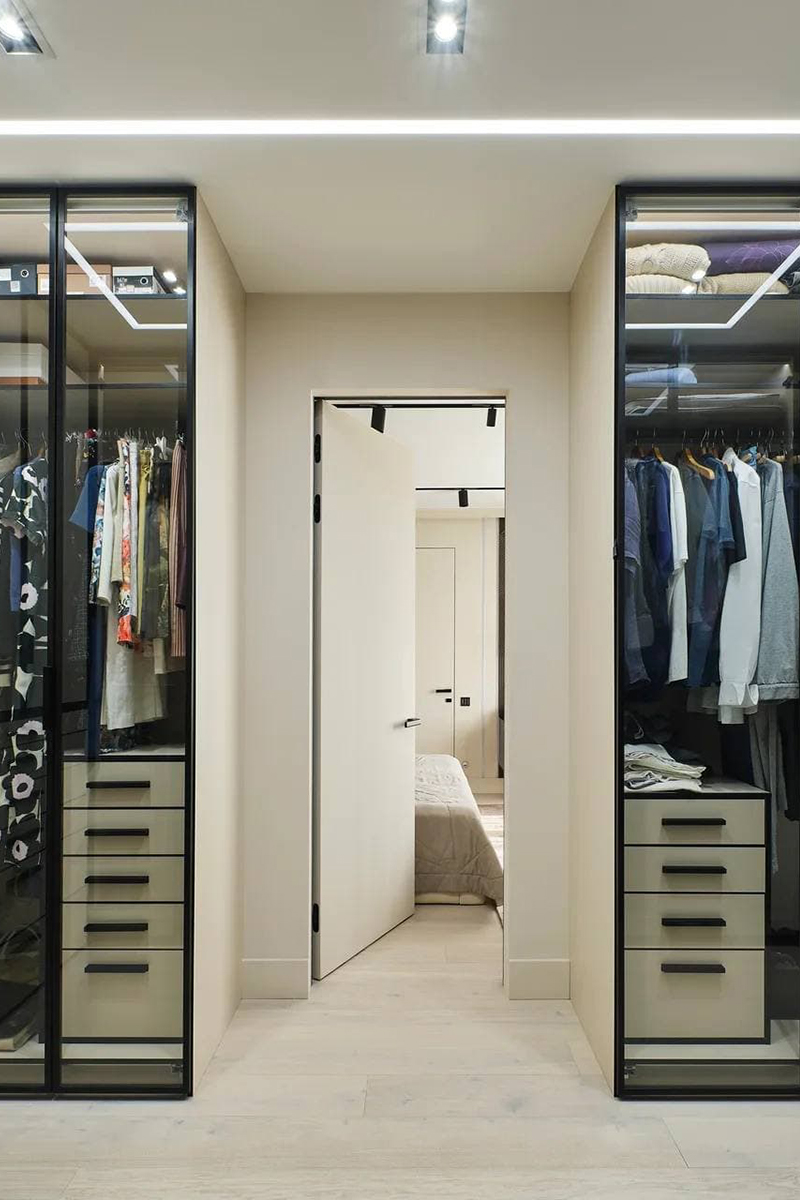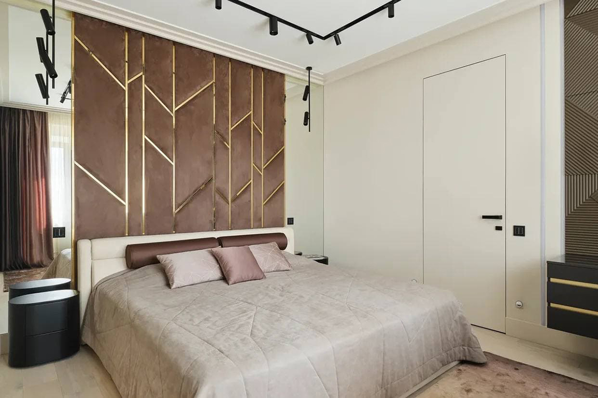 The basis for the design is a geometric pattern that is repeated in the rooms. At the entrance we see an elegant ornament on the floor, reminiscent of Herringbone, living room has a wooden panel in the TV zone, bedroom is adorned by thin diagonal lines on a soft bedhead panel and in the décor of the mirror. The visual effect is made stronger by striking black lines on the walls, furniture, glass dividers and lamps.