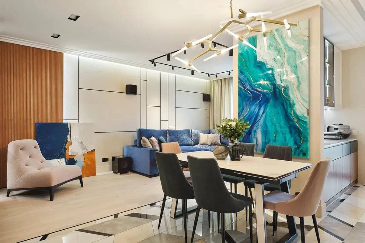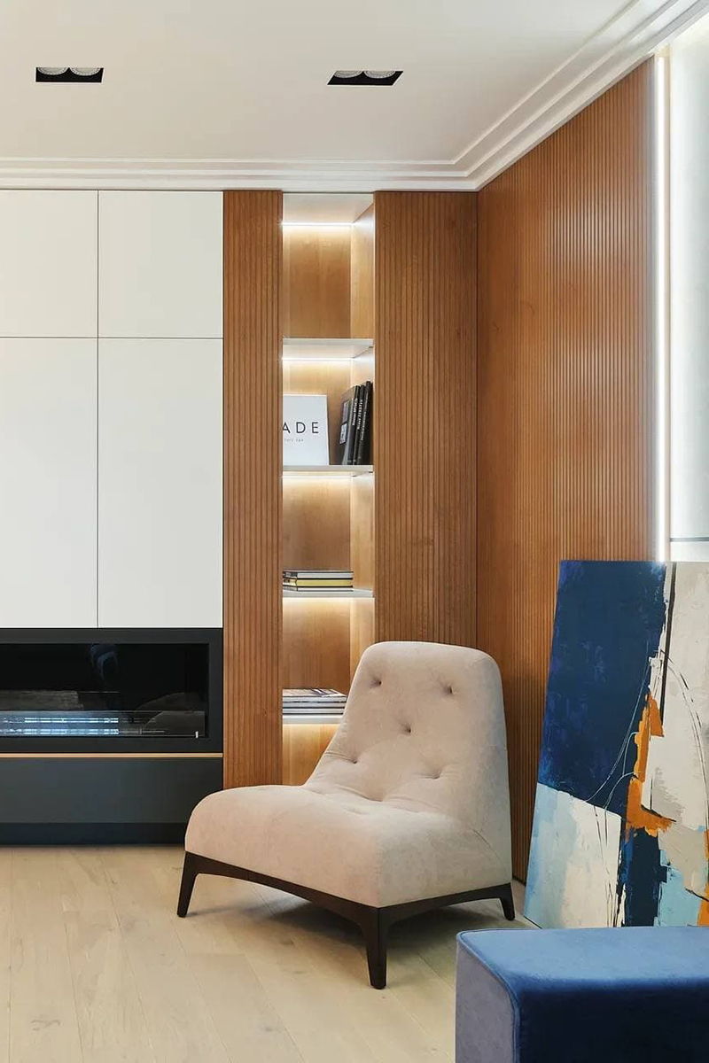 To accentuate exclusive furniture pieces and décor that were made for this project walls have a neutral milky palette that continues in the soft tone of Coswick oak flooring. Milk white, black and caramel colours are accompanied by deep blue of the couch in the recreation zone to underscore its importance as the centre of family pastime. It was further reinforced by a painting by Maria Chudinova (Shvetsova), designer, which brought together all the colours and made a beautiful addition to the living room.
