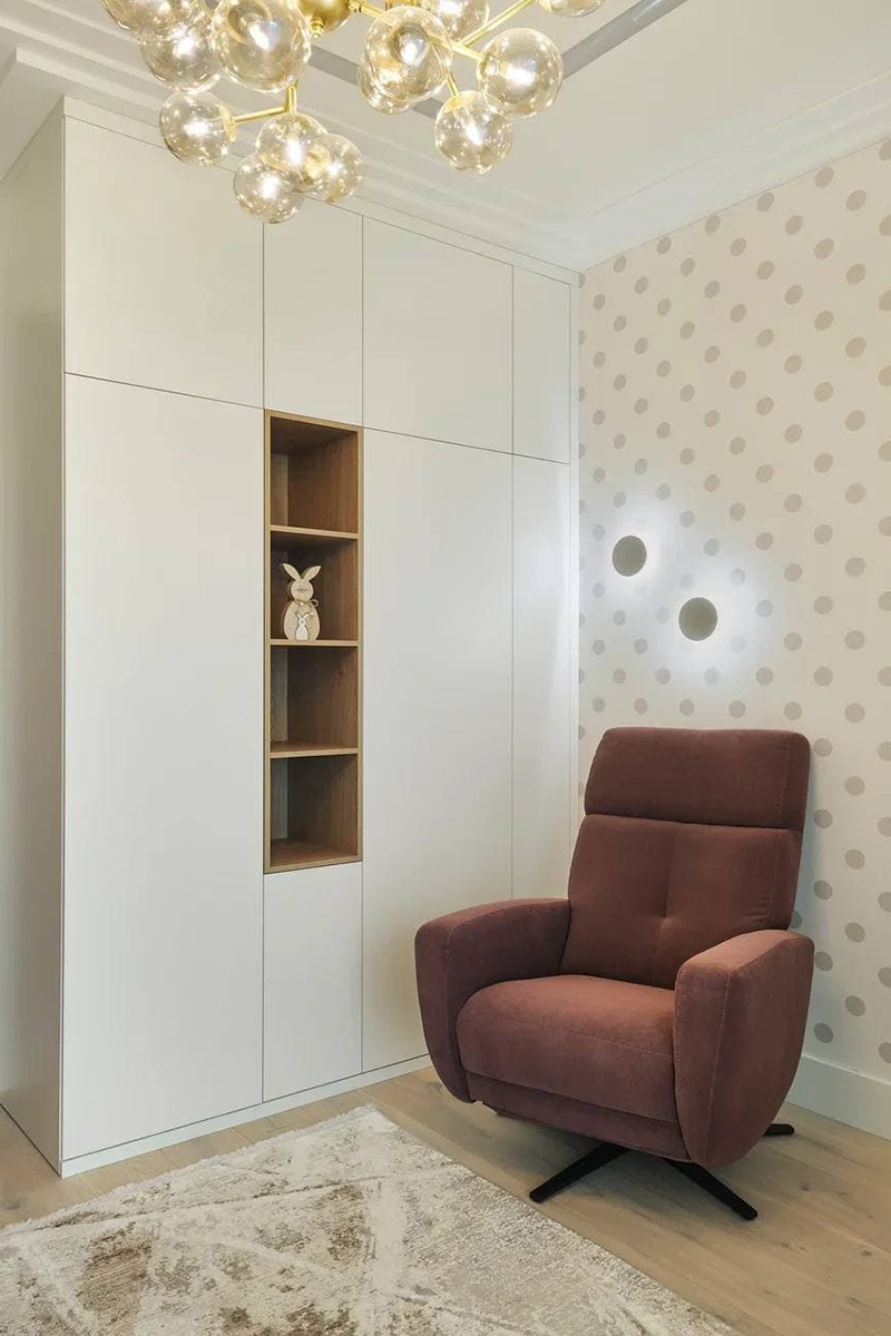 To make the space as functional as possible the apartment underwent a major replanning. The kitchen was combined with the living room, the living space and the storage room was increased.