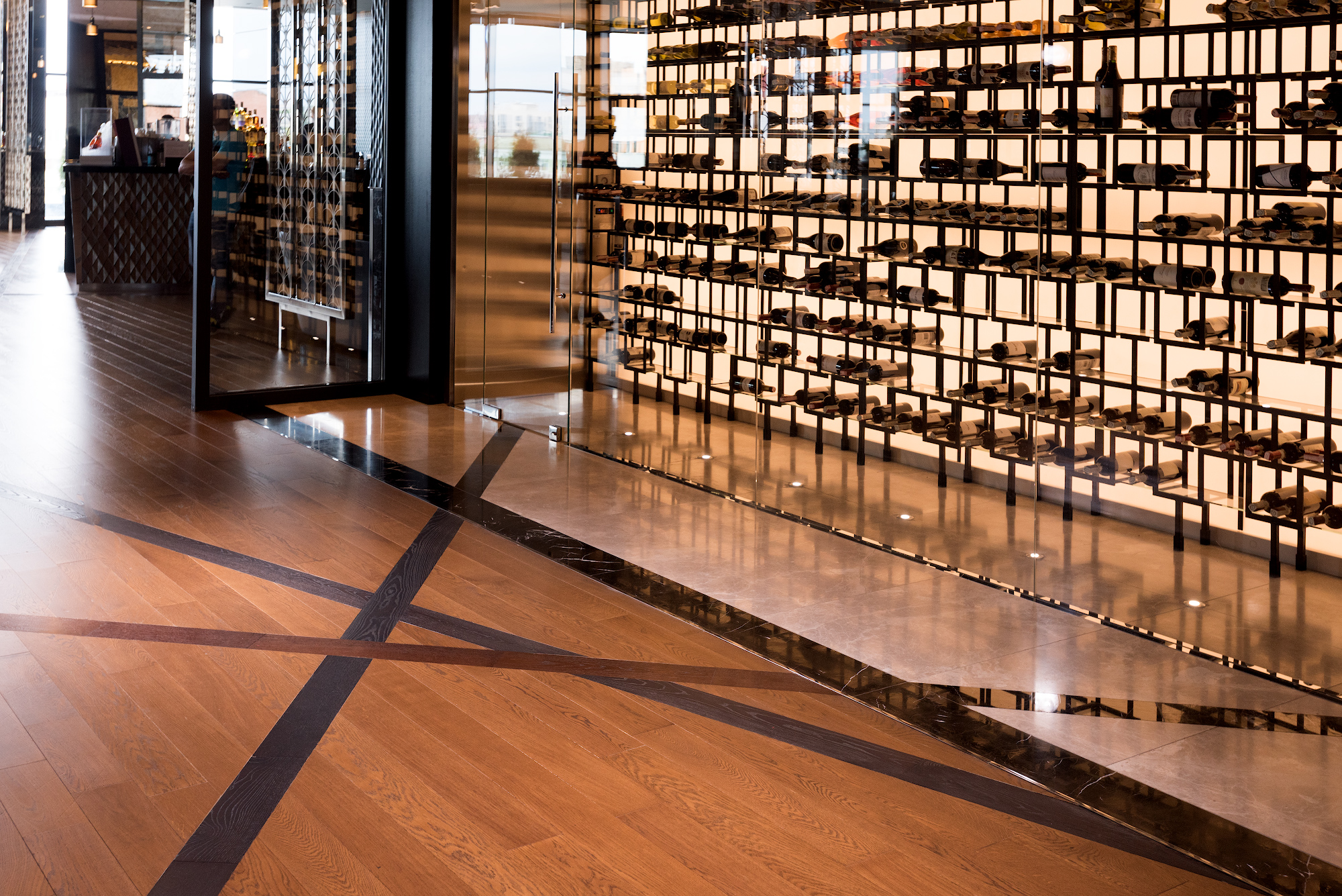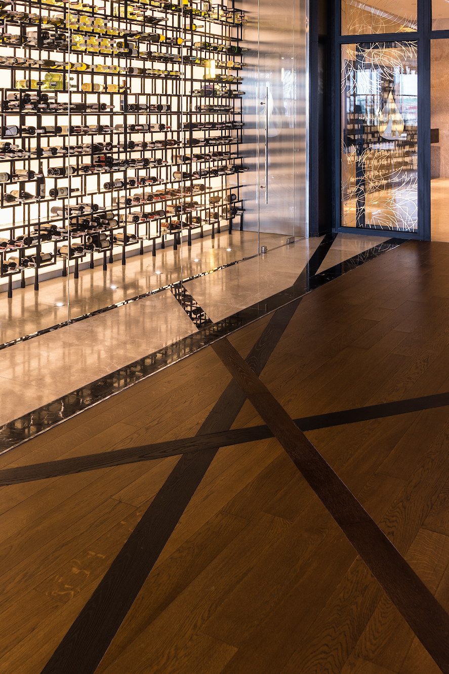 A complex flooring pattern with contrasting inserts brings a certain dynamic to this calm and elegant space.
