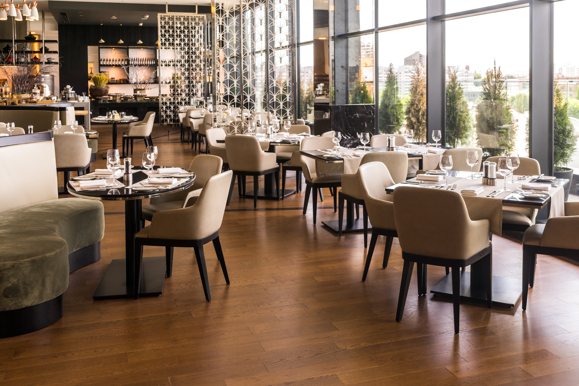 The Ember restaurant at the DoubleTree by Hilton Minsk Hotel fully justifies its status and affiliation with the well-known international Hilton Worldwide chain. The impeccable interior is successfully supplemented by a picturesque view of the historical center of the Belarusian capital, which opens from panoramic windows.