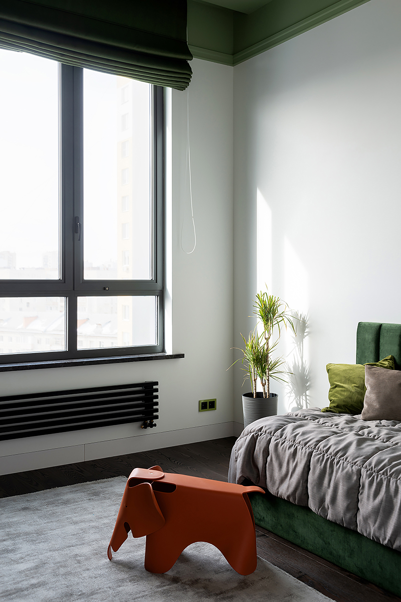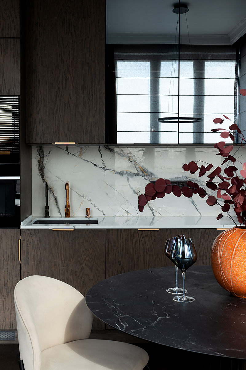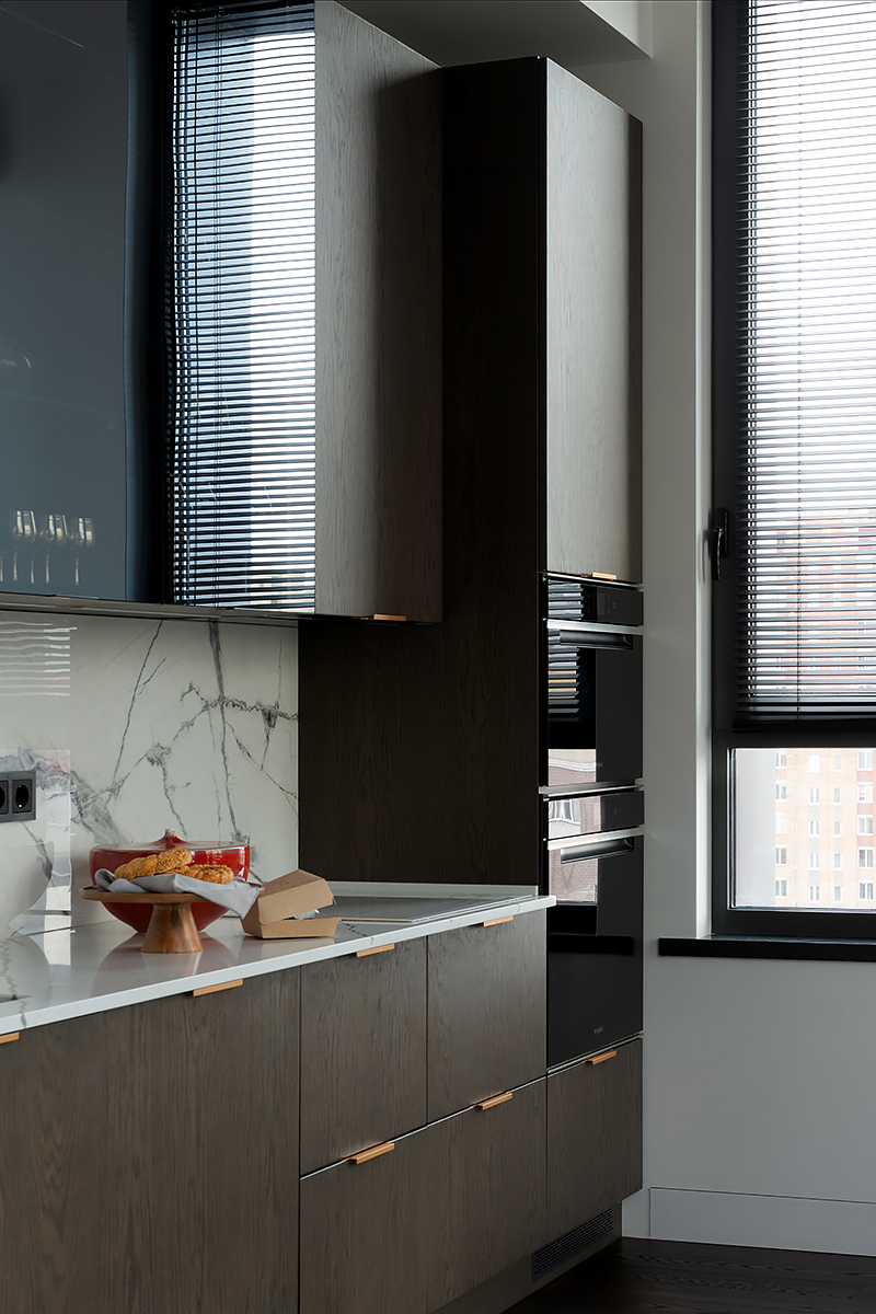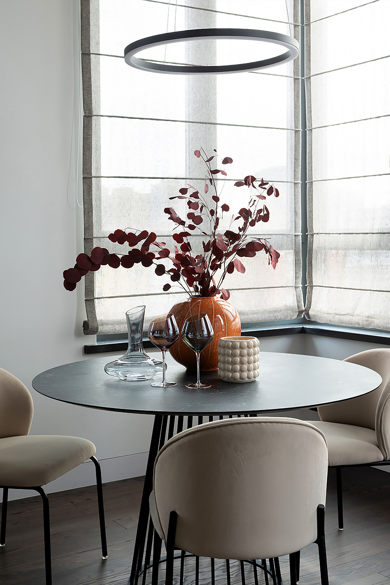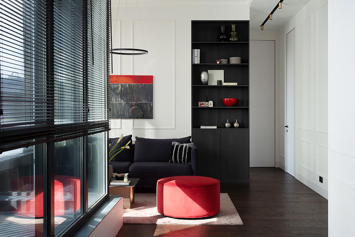 The main idea of this interior was the game of contrasts. But the chosen colors are not flat, they are complex and deep: Coswick Mocca hardwood floors, rich cranberry padded stool and graphite furniture and windows.