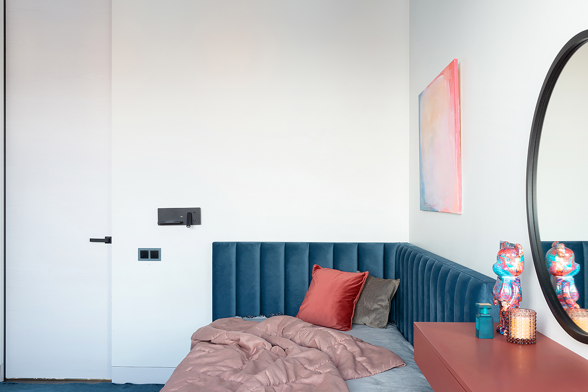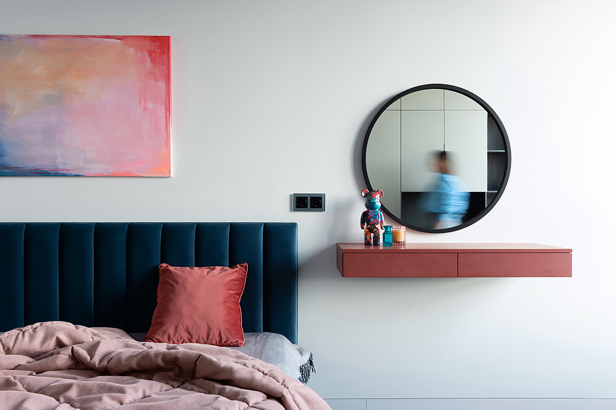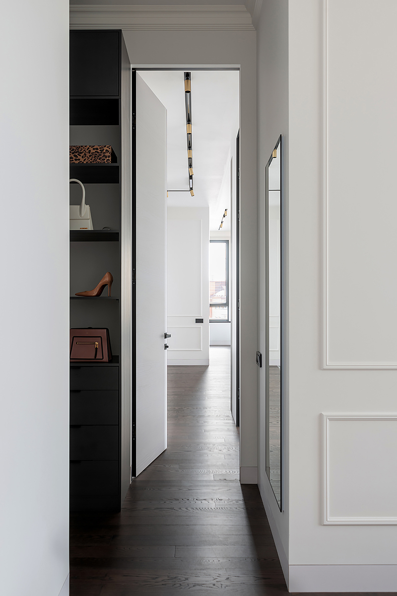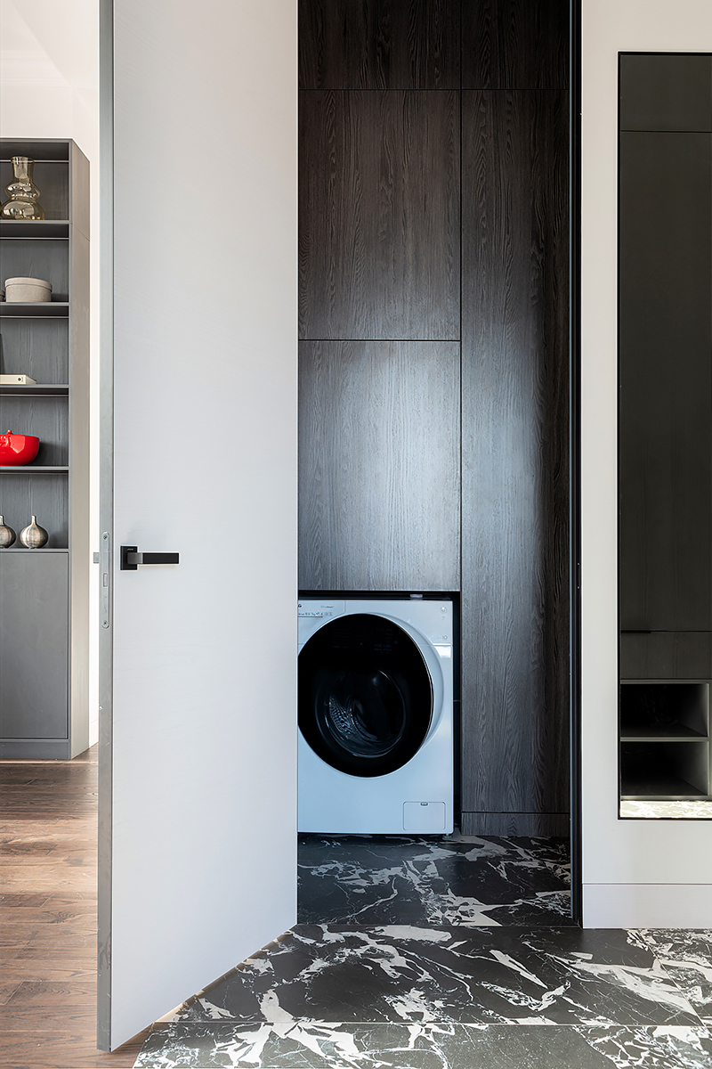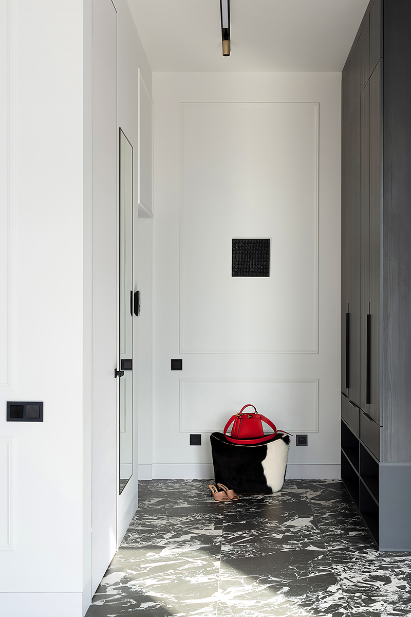 The main idea of this interior was the game of contrasts. But the chosen colors are not flat, they are complex and deep: Coswick Mocca hardwood floors, rich cranberry padded stool and graphite furniture and windows.