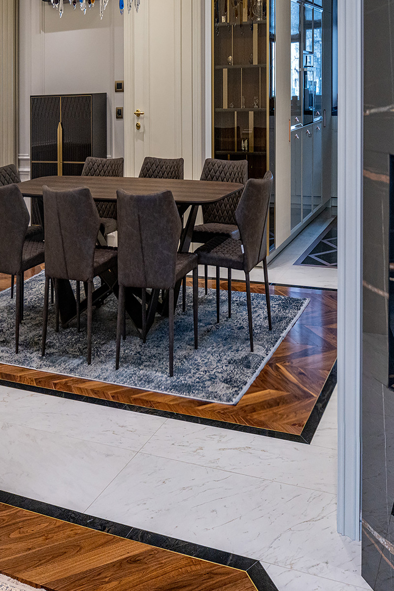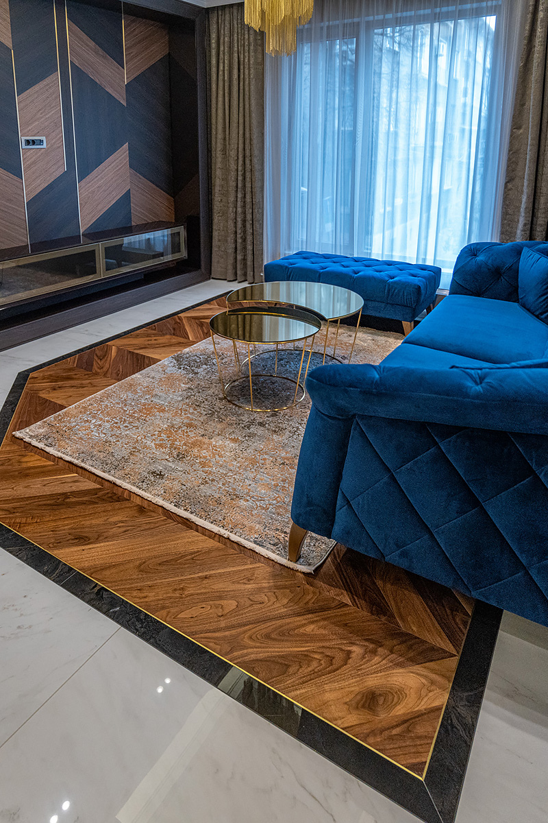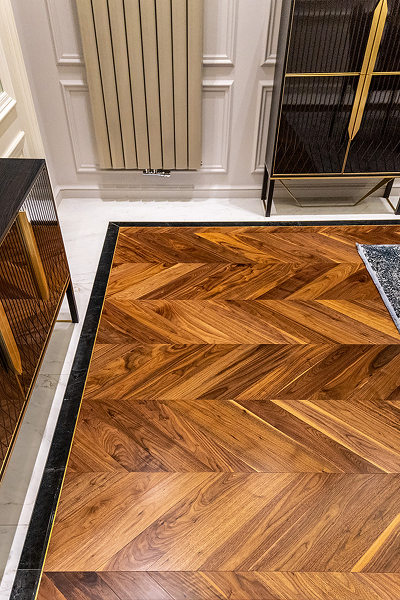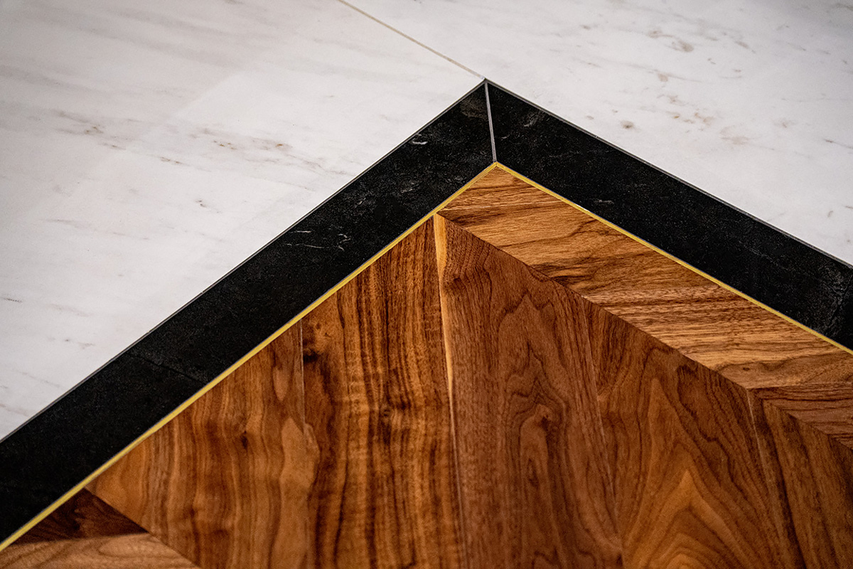 Exquisite workmanship of Bulgarian masters. Combination of stone and wood in the flooring requires immense precision and care. This project also has brass inlays framing American Walnut Chevrons. Each material has its own character, properties important for installation and micro-climate. Joining it all together so that the flooring looks new and crisp is a feat for only the best professionals.