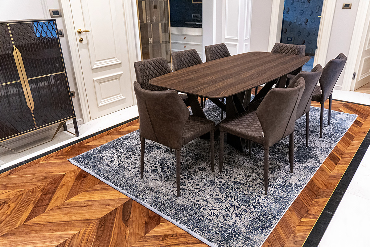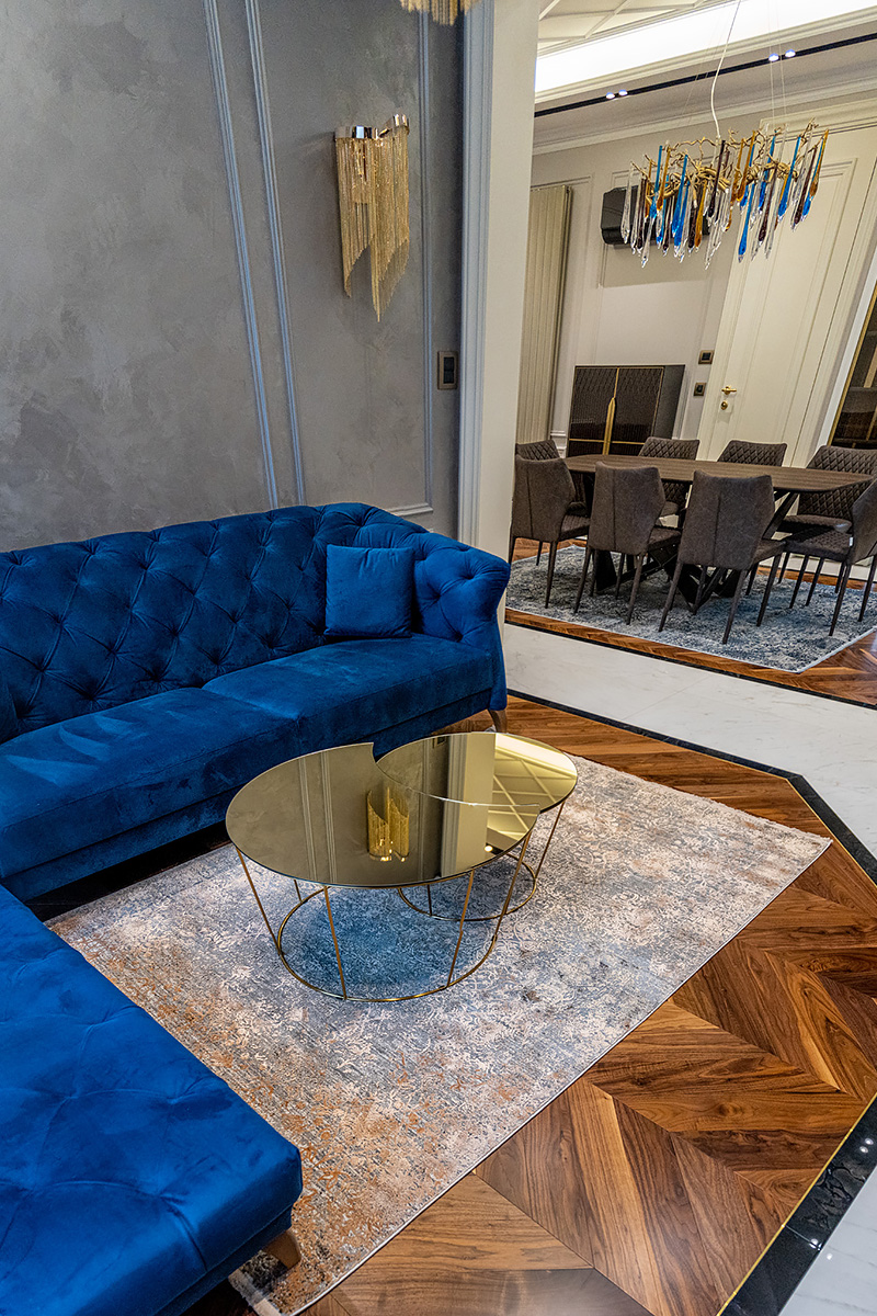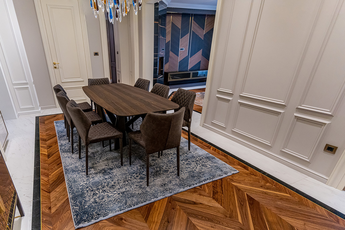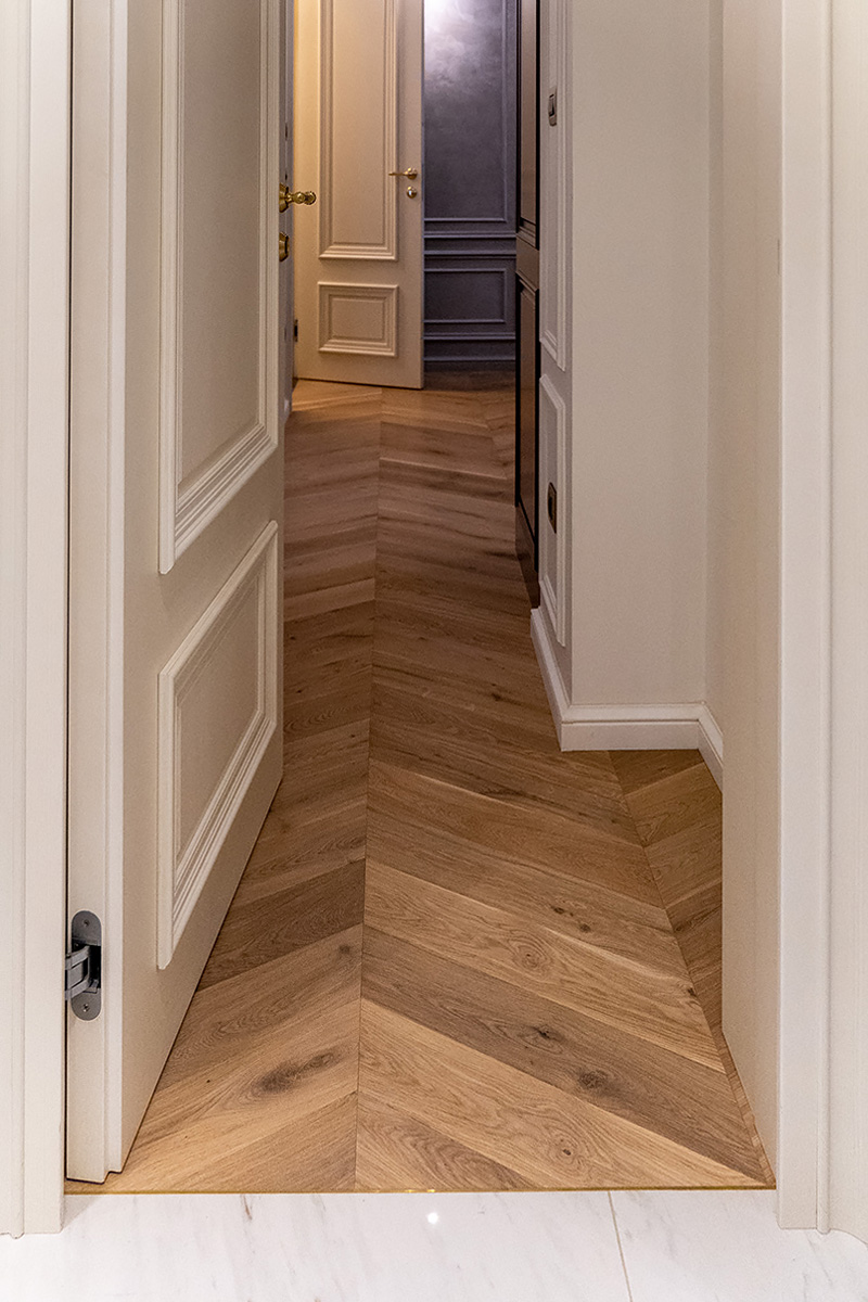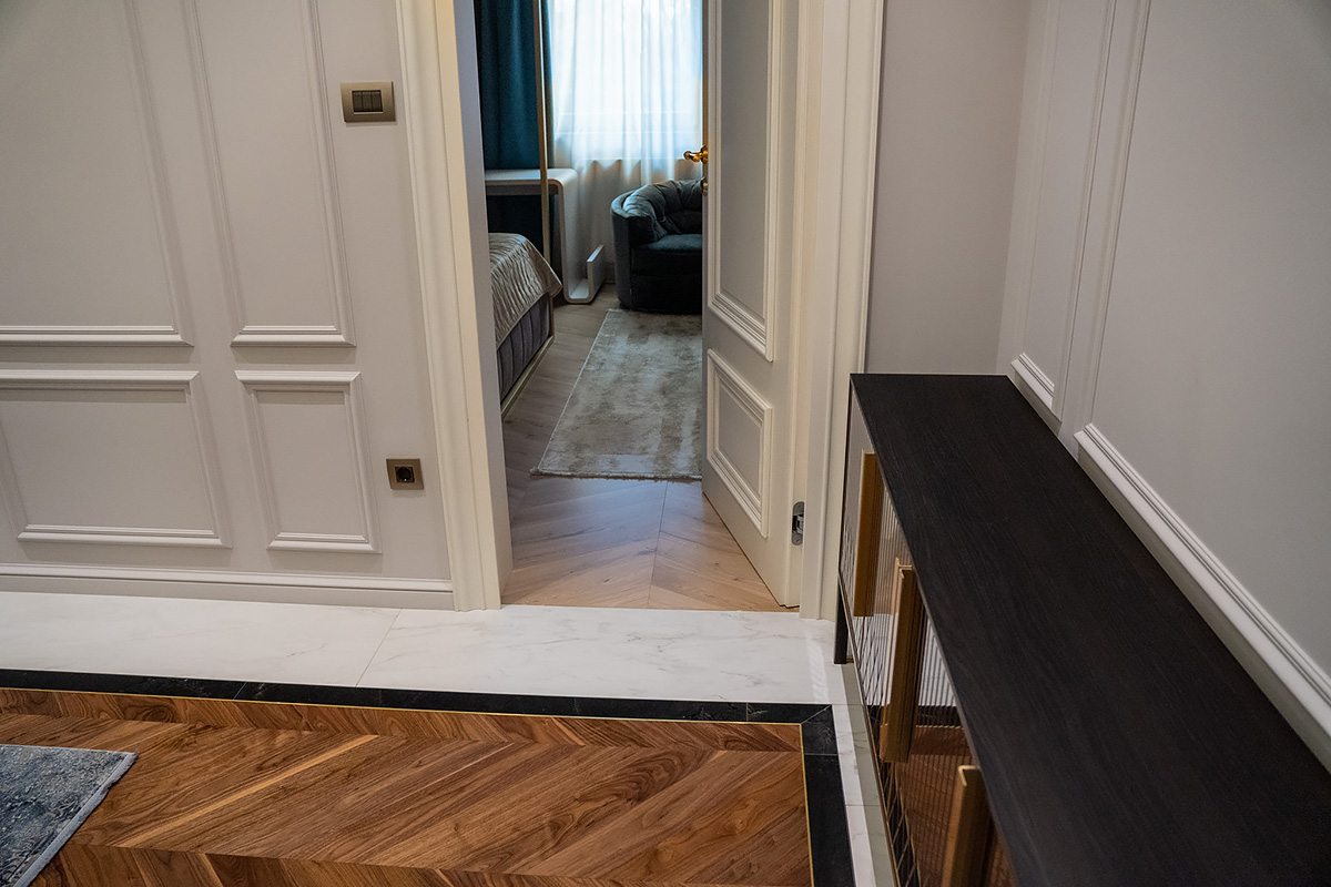 Exquisite workmanship of Bulgarian masters. Combination of stone and wood in the flooring requires immense precision and care. This project also has brass inlays framing American Walnut Chevrons. Each material has its own character, properties important for installation and micro-climate. Joining it all together so that the flooring looks new and crisp is a feat for only the best professionals.