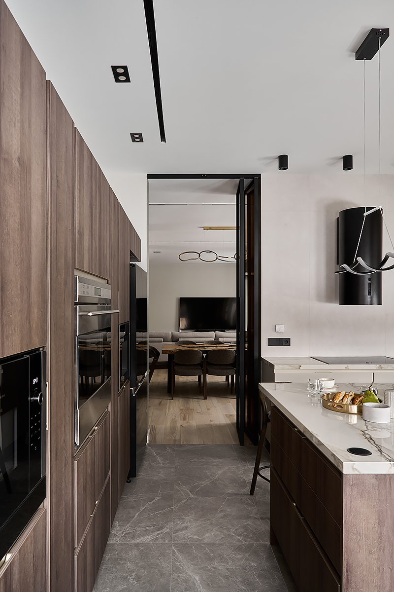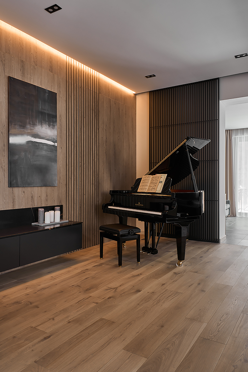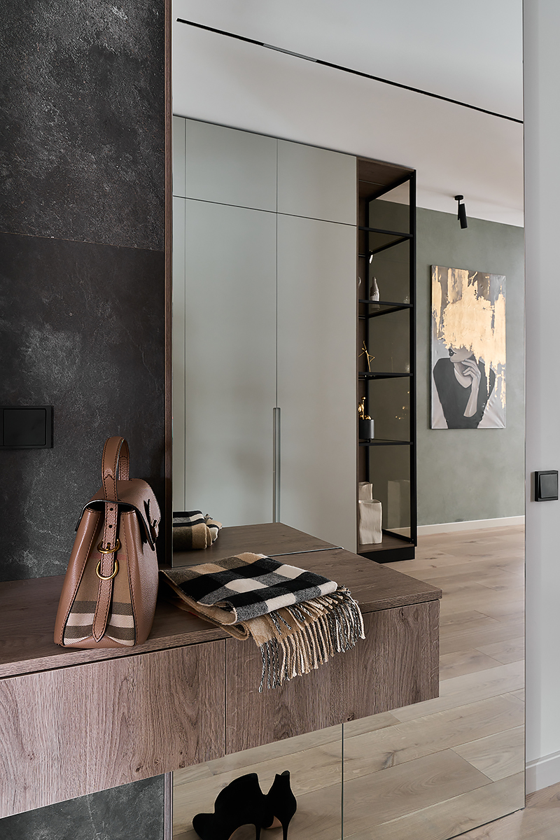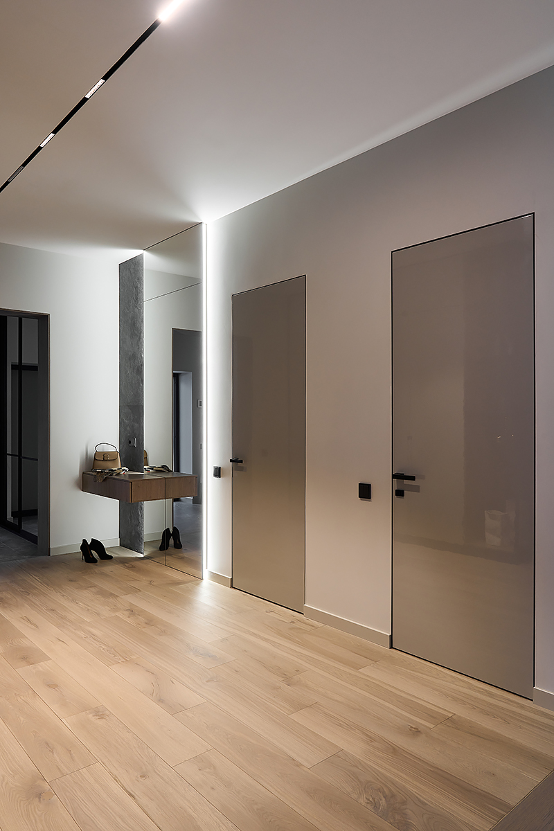 The owners of the private apartment were looking for a modern, stylish, balanced interior. Muted color tones and noble gray, warm wood, concise lines and delicate décor make the apartment look harmonical and classically accurate.