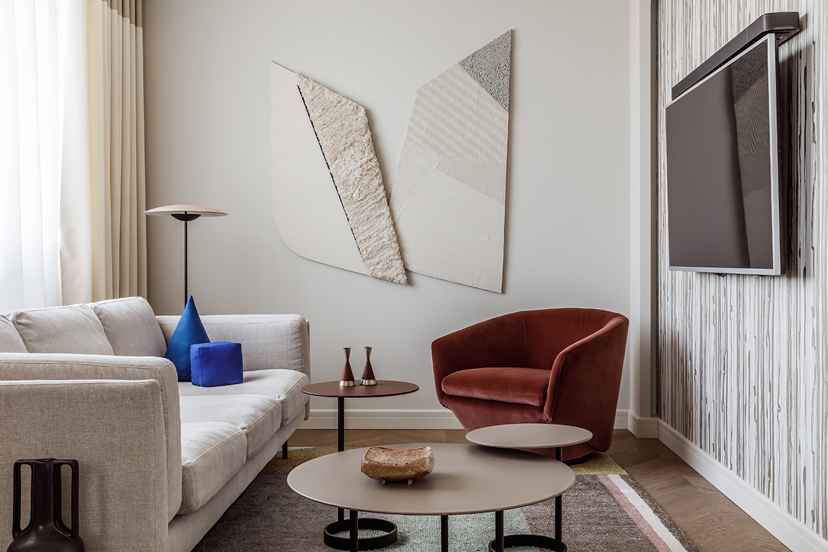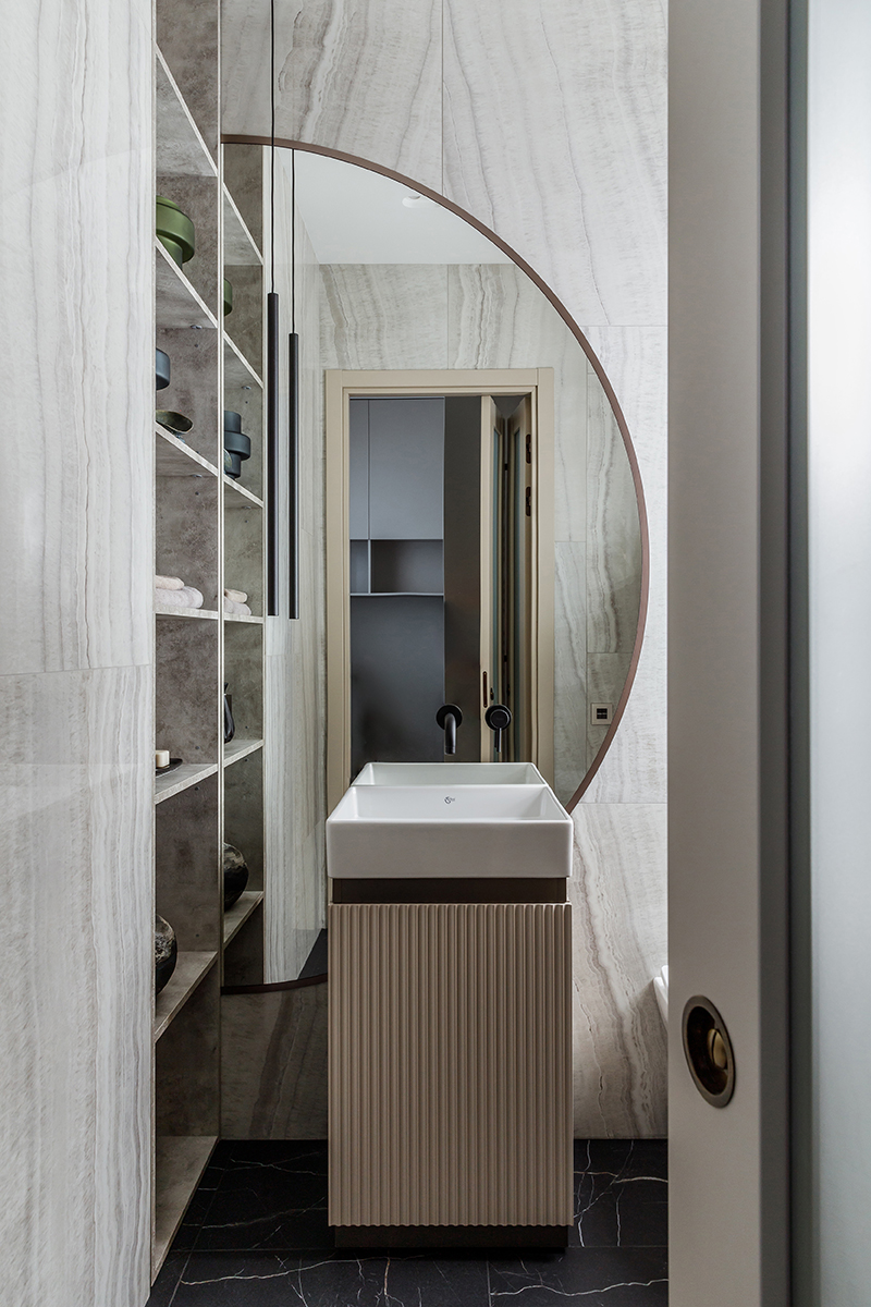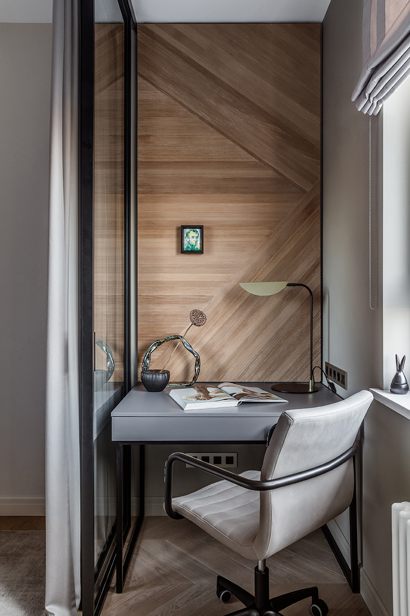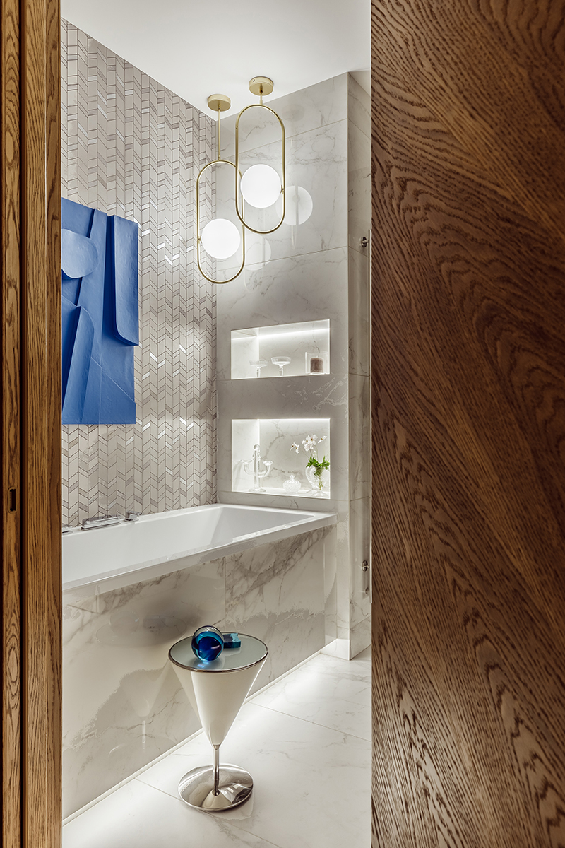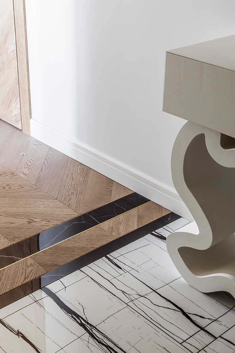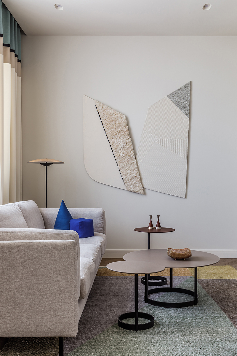 There were also interesting solutions in the non-standard junction of the engineering board and porcelain stoneware. The scale and shape of the art object slightly knocked down the correct and verified lines in space, and the idea of ​​​​the neighborhood of recycled materials with noble ones (in particular, with leather upholstery of coffee tables and silver vintage modernist candlesticks) added irony, while maintaining its elegance.”