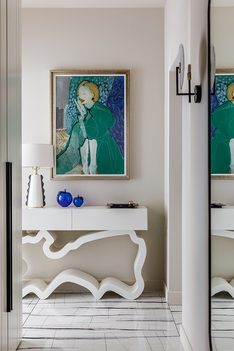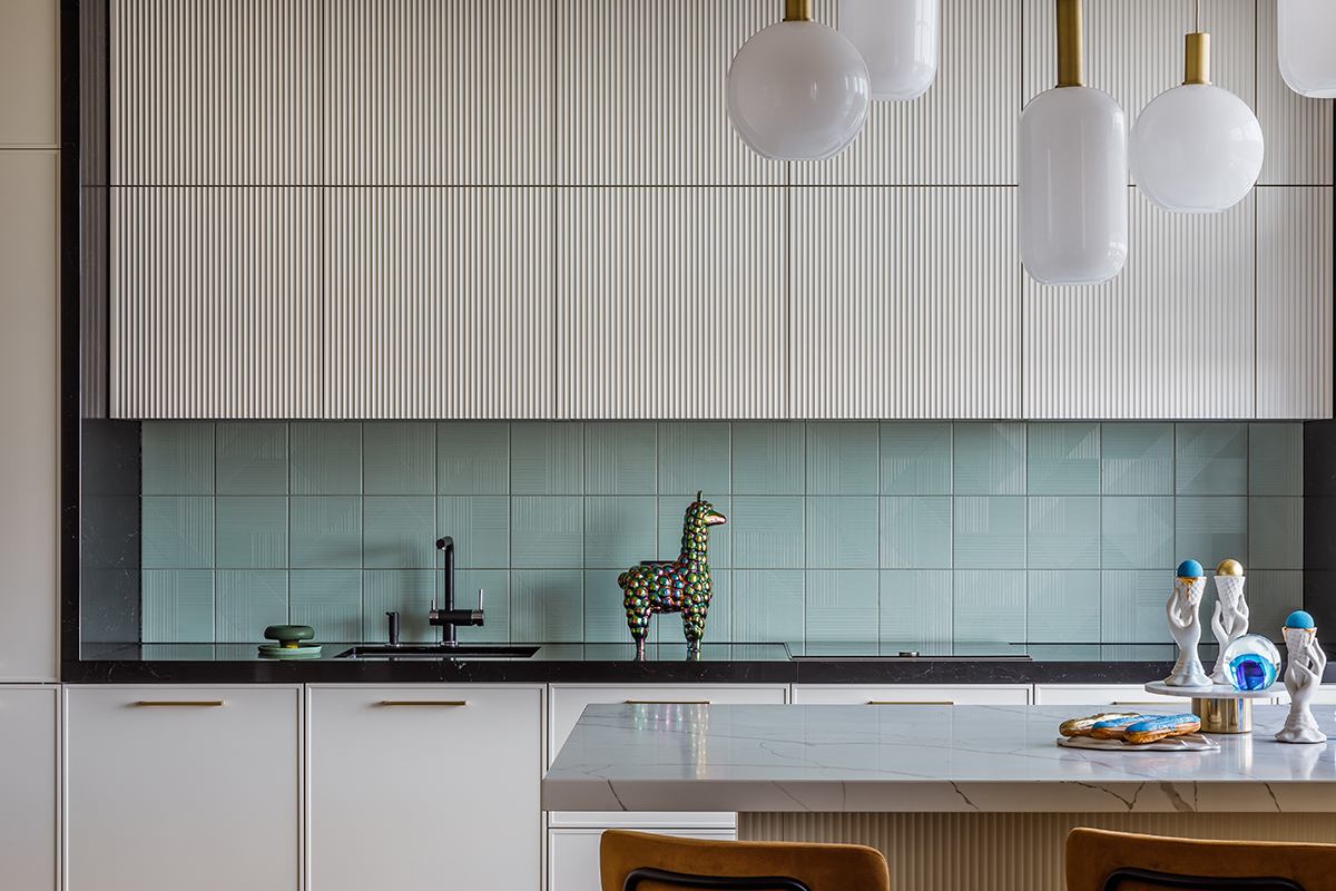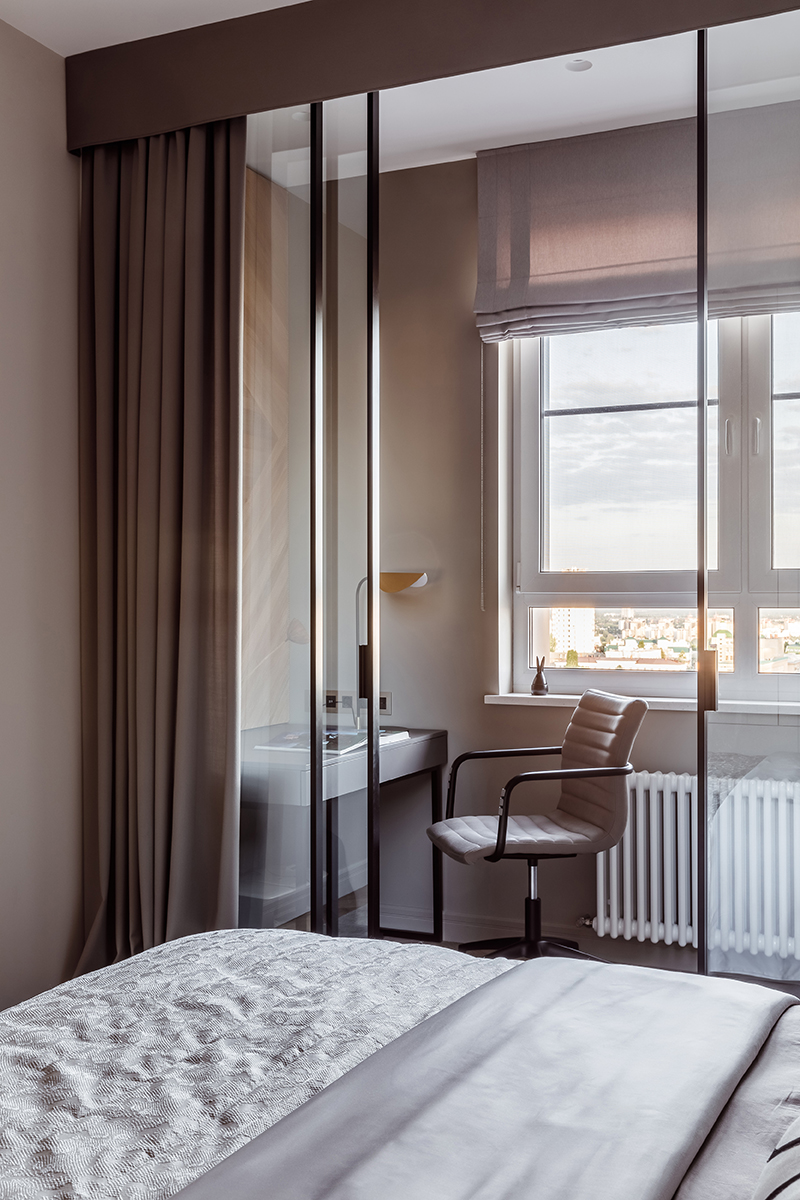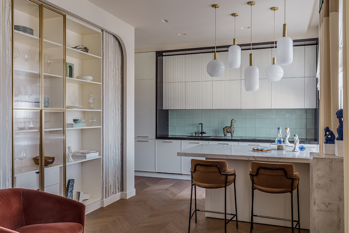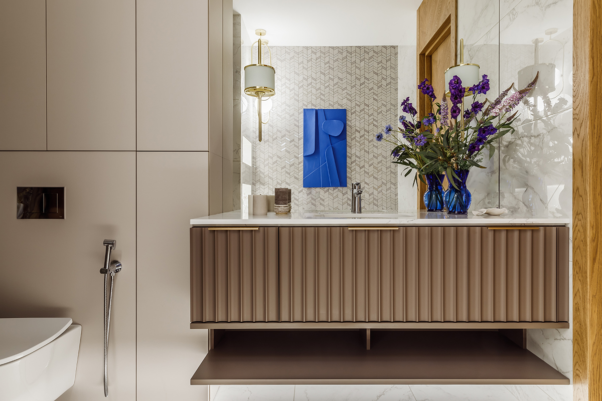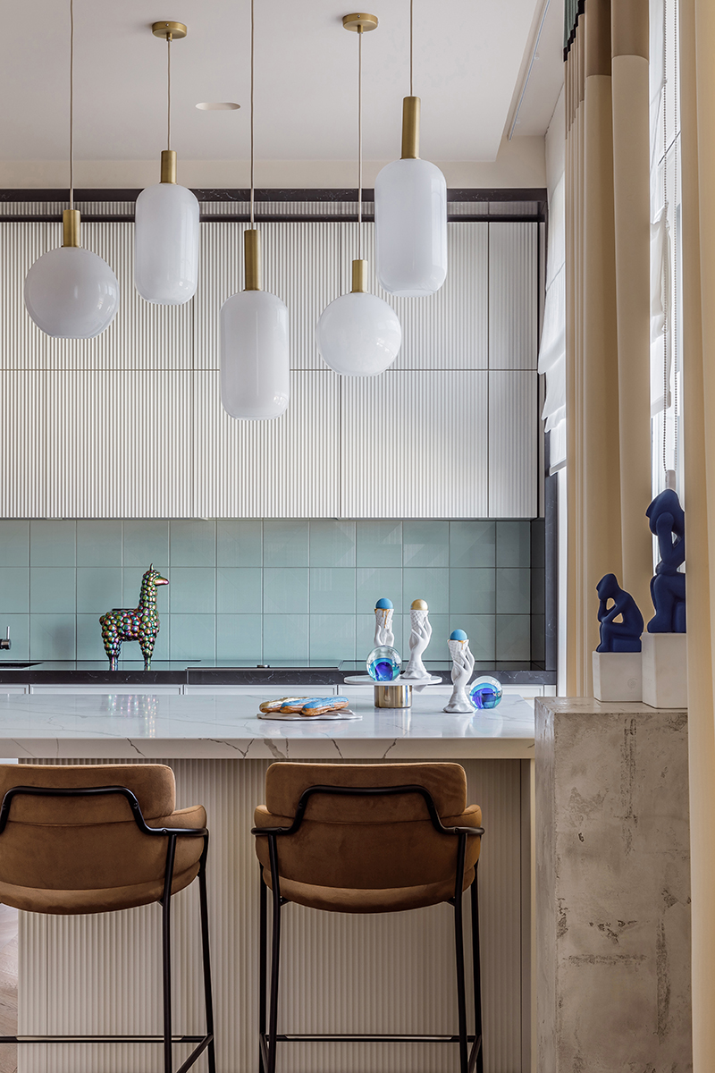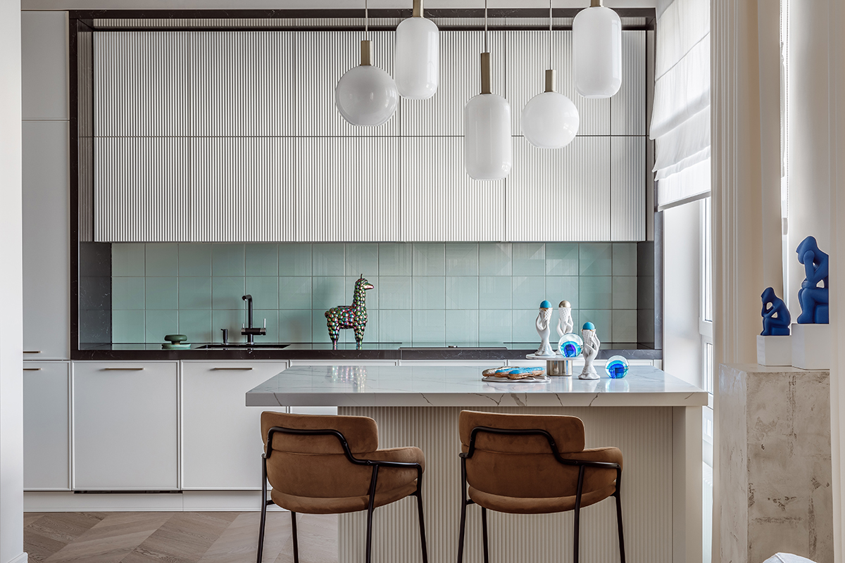 There were also interesting solutions in the non-standard junction of the engineering board and porcelain stoneware. The scale and shape of the art object slightly knocked down the correct and verified lines in space, and the idea of ​​​​the neighborhood of recycled materials with noble ones (in particular, with leather upholstery of coffee tables and silver vintage modernist candlesticks) added irony, while maintaining its elegance.”