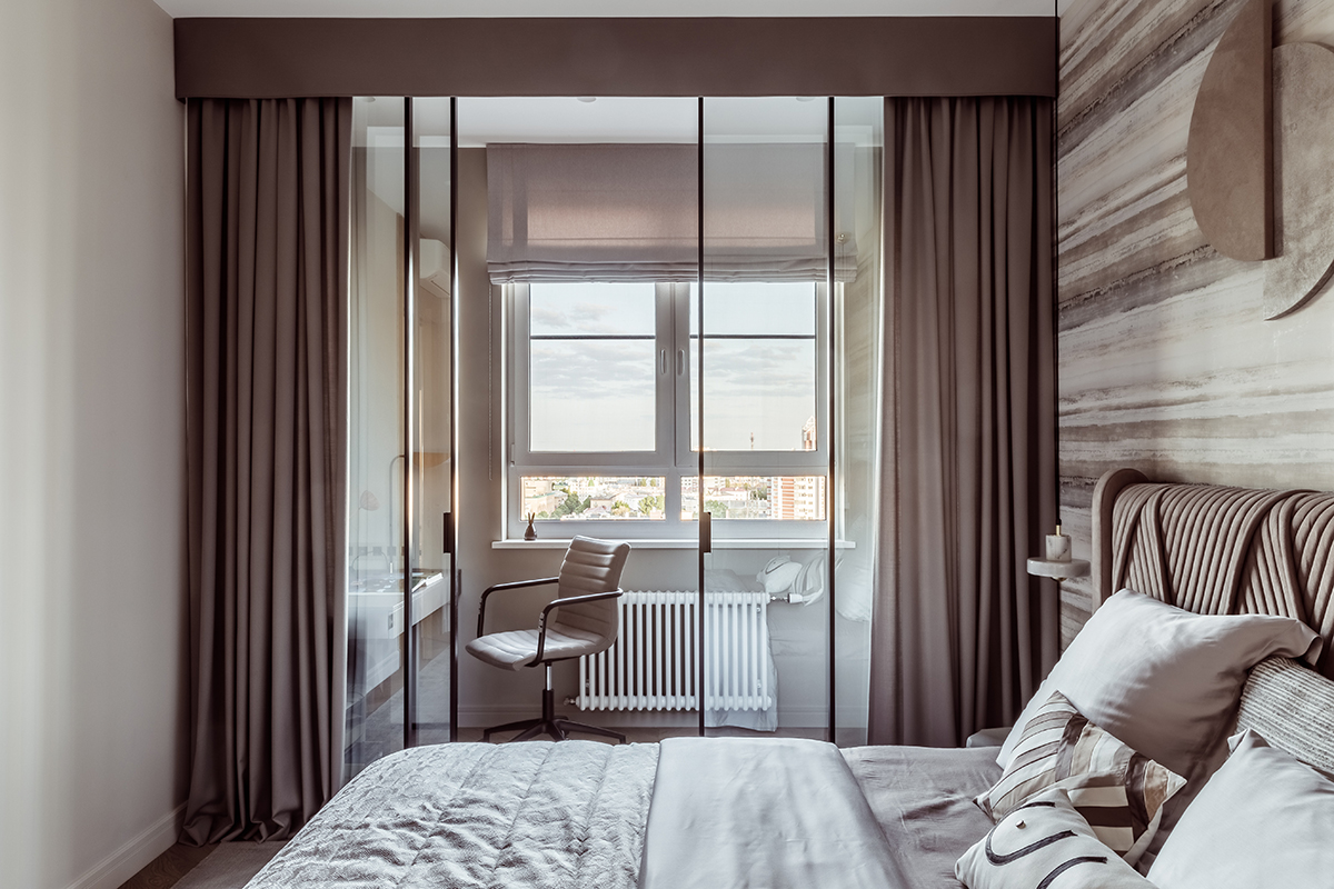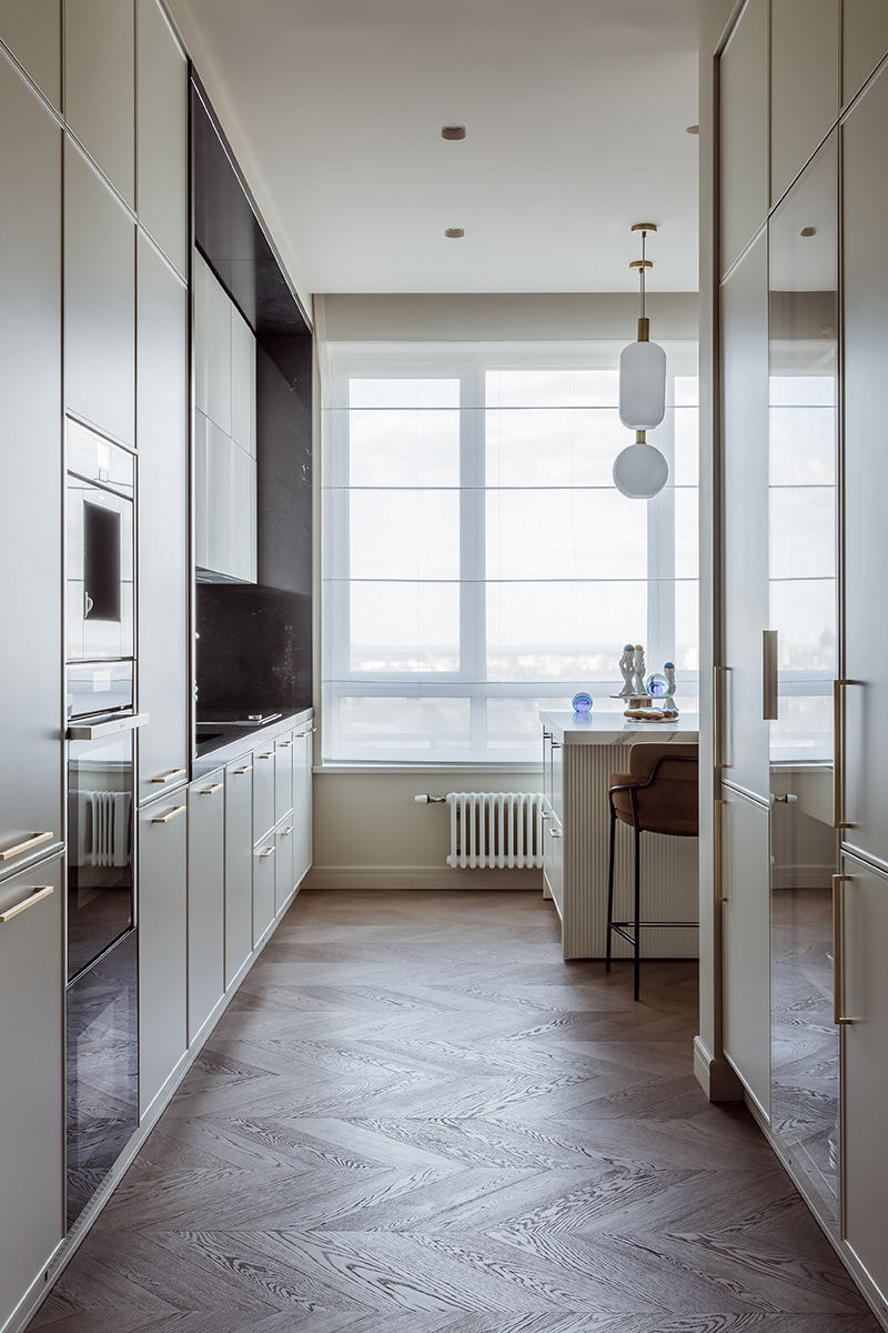 Apartment with an area of ​​90 sq. m. is located in the center of Voronezh, in the new residential complex “Solar Olympus”. The main drawback was a very impressive L-shaped and non-functional corridor with a window. By dividing it into several rooms, we gave the space the right shape, organize an entrance hall, a guest toilet and even a laundry room.