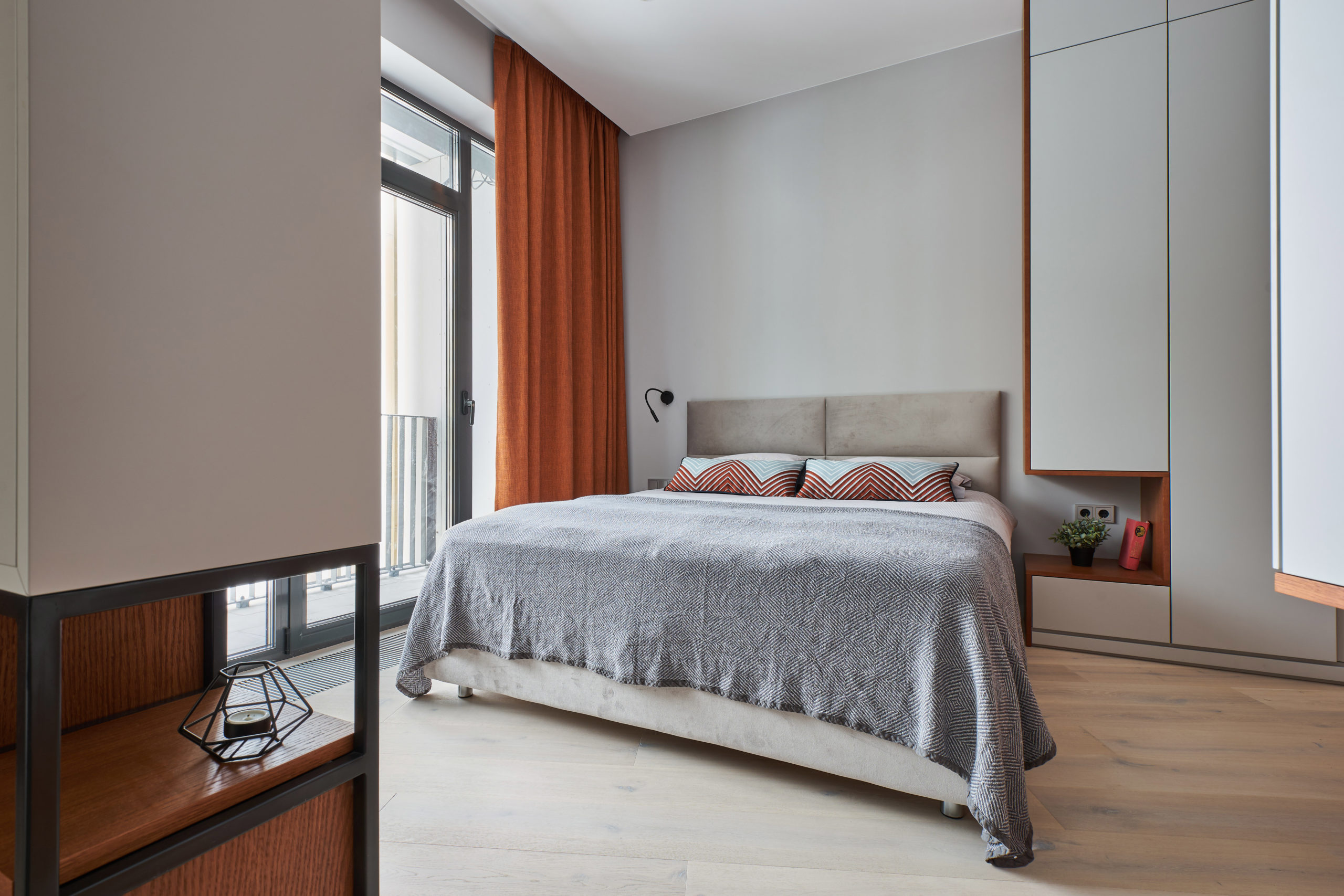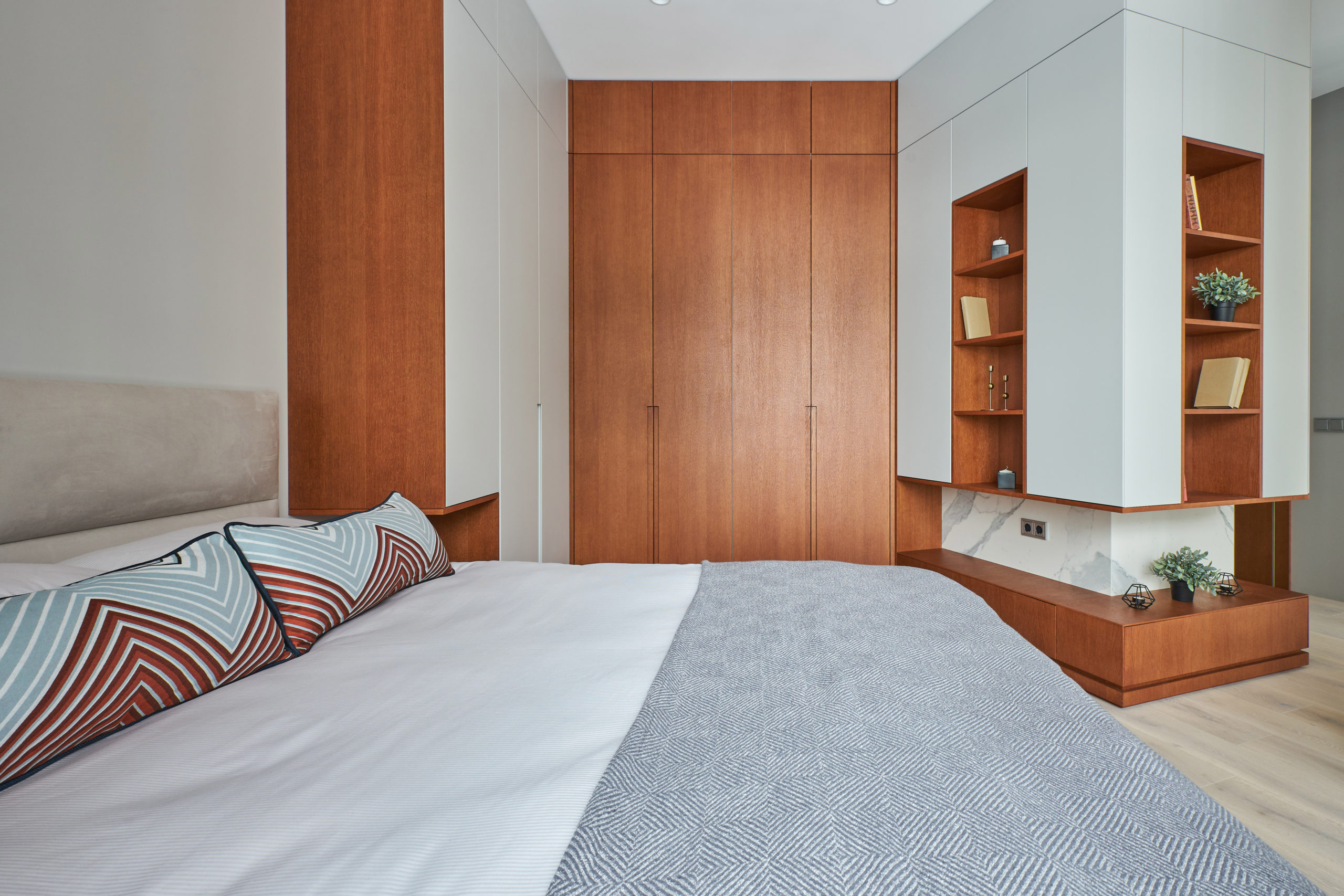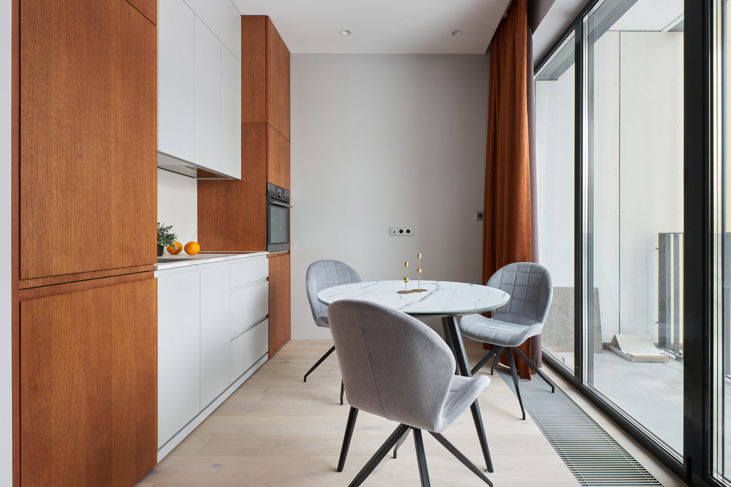 The main criteria for choosing furniture and finishing materials were a high quality, reliability and durability. All the furniture is made according to the designer’s sketches. The neutral light-grey color of the walls and faсads of furniture is complimented by a light, but warm shade of the floor, which was chosen plank hardwood flooring Coswick.