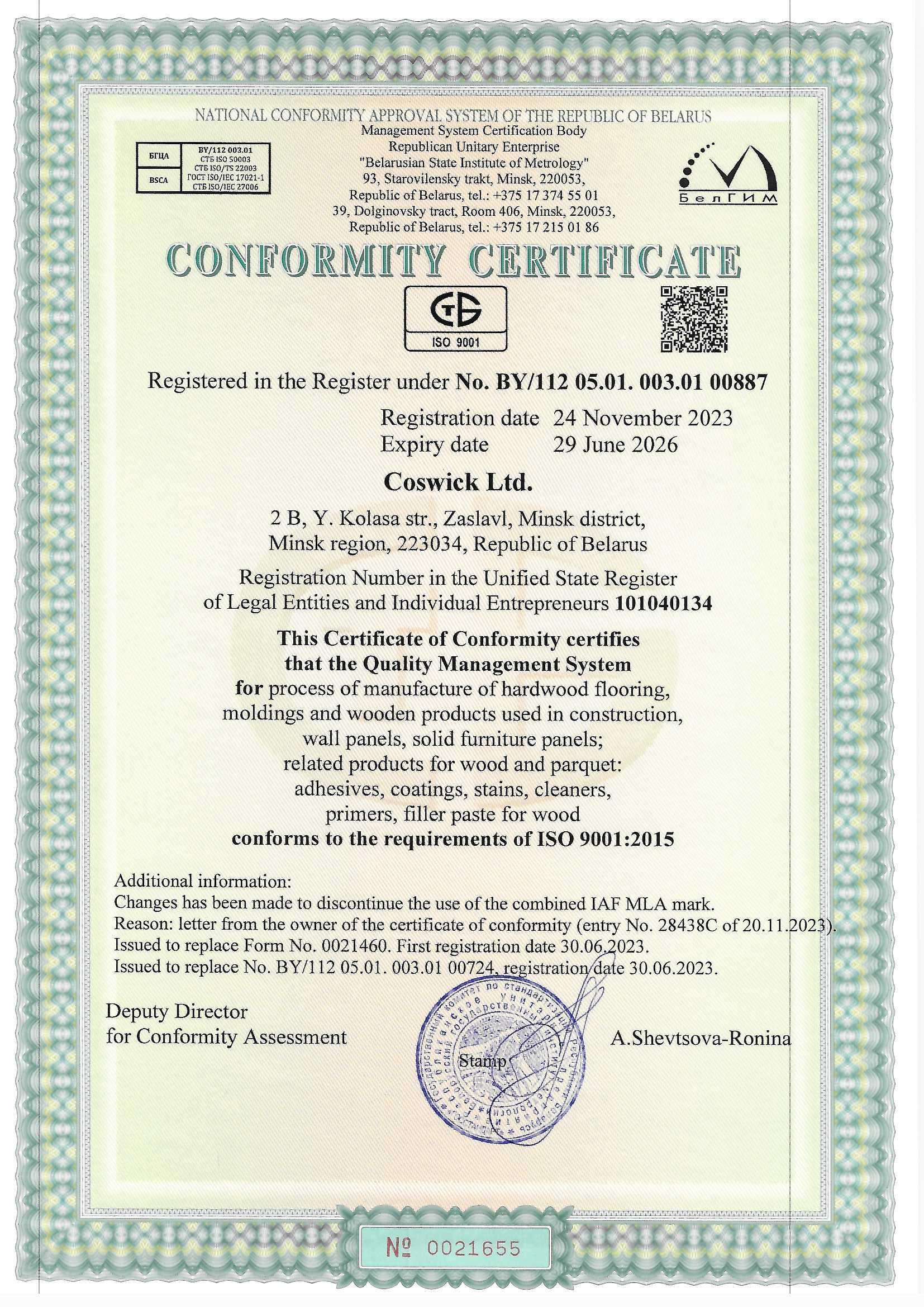 The corresponding certificate of the State measurements unity assurance system of the Republic of Belarus, issued by an accredited body – BelGIM – on the certification of quality management systems, certifies that the quality management system, which ensures the production of high-quality goods, was successfully developed and implemented on-site.